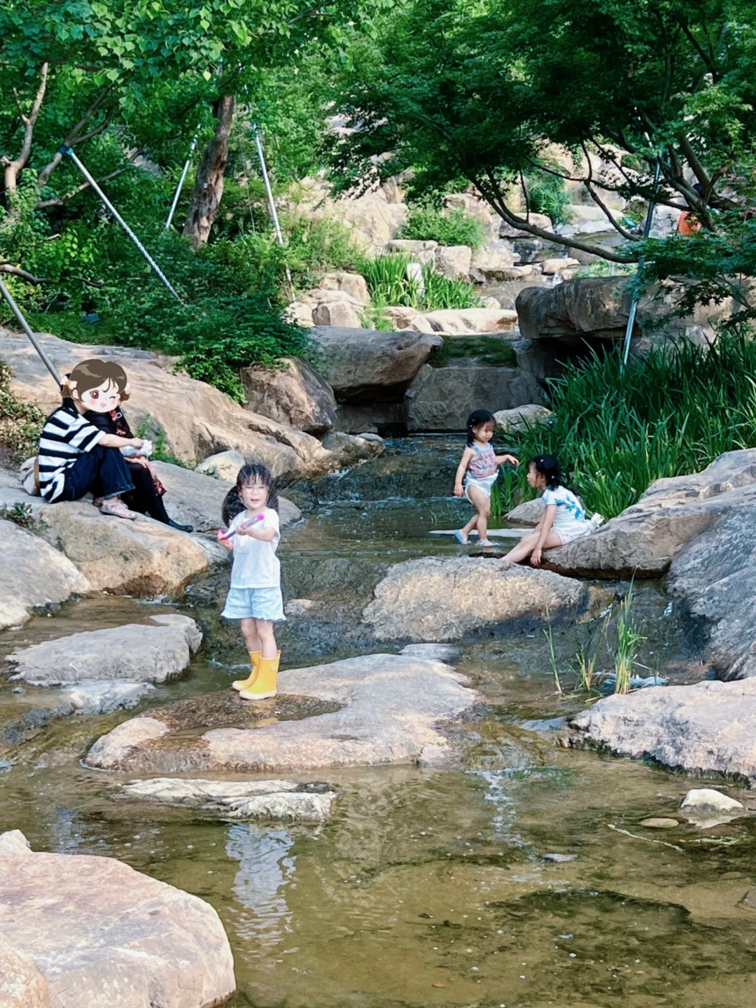 从入口步行2分钟经弟一观景台后顺着水流声左拐就到了。有好几处浅滩,部分🉑️涉水,有些区域只能在岸边嬉水,有保安👀管。潺潺溪水,听泉水叮咚,小朋友超开心