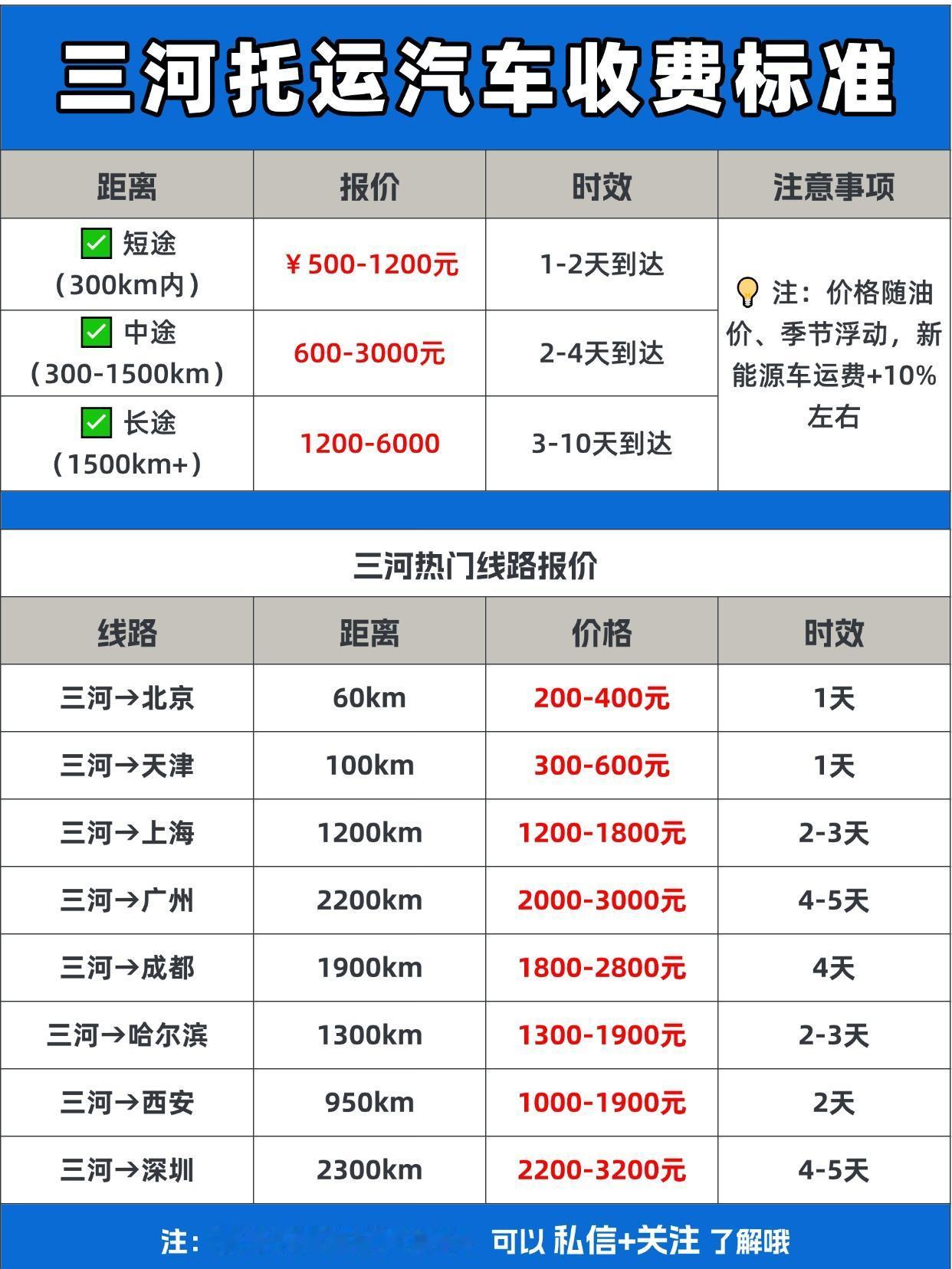 ✅ 三河发运全国报价区间 普通轿车从三河发往一二三线城市,运费一般是1-1.5元/公里;如果是四五线城市或更偏远地区,则可能上涨到2-2.5元/公里。 拿一台普通的家用车举例: •短途(500公里以内):大约500-750元 •中长途(1000公里左右):大约1000-1500元 •长途(2000公里左右):大约2000-3000元 运输时效方面,一般需要3-10天,具体取决于目的地距离和运输方式 📑 私家车托运必备手续 1️⃣ 证件类: ✔ 车主身份证复印件 ✔ 行驶证原件/复印件(随车或交物流) 2️⃣ 验车交接: ✔ 签订运输合同(确认保险、划痕条款!) ✔ 拍摄车辆360°视频+油量表(留底!) ✔ 清空个人物品 ✔ 清空个人物品,ETC卡拔掉! 3️⃣ 保险: ⚠️ 确认公司赠送基础险(通常保车价‰3),高价值车建议补买全额险! 🔋 新能源汽车托运特别注意 新能源车核心是电池,托运时要格外留心: •电量准备:建议保持中等电量,类比燃油车需保留能行驶约80公里的油量,以应对挪车需求。 •电池安全:选择有新能源车托运经验的物流公司,他们会用专业的固定装置,避免运输中对电池造成碰撞和挤压。 •环境控制:理想情况下,应选择能提供恒温运输服务的车辆,避免电池处于极端温度环境中。 •特殊规定:如果选择铁路运输,电池荷电状态不得超过65%,且不能夹带备用电池。 💎 托运小贴士 •清理物品:贵重物品、易燃易爆品务必提前拿走。 •购买保险:确认车辆价值是否在保险覆盖范围内,超出的部分是否需要额外购买。 •选择公司:一定要找有资质、口碑好的正规公司,价格过低要警惕