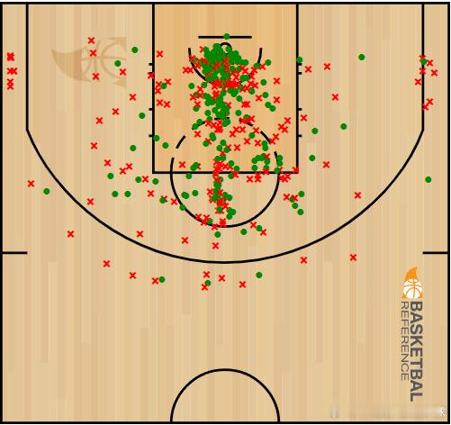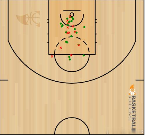 对这两场雷迪克使用艾顿的方式是满意的,来看对比,左图是艾顿上赛季的投篮点,右图是开赛以来的艾顿投篮点,几乎完全分布在油漆区——艾顿在最高效的区域接球去完成出手。