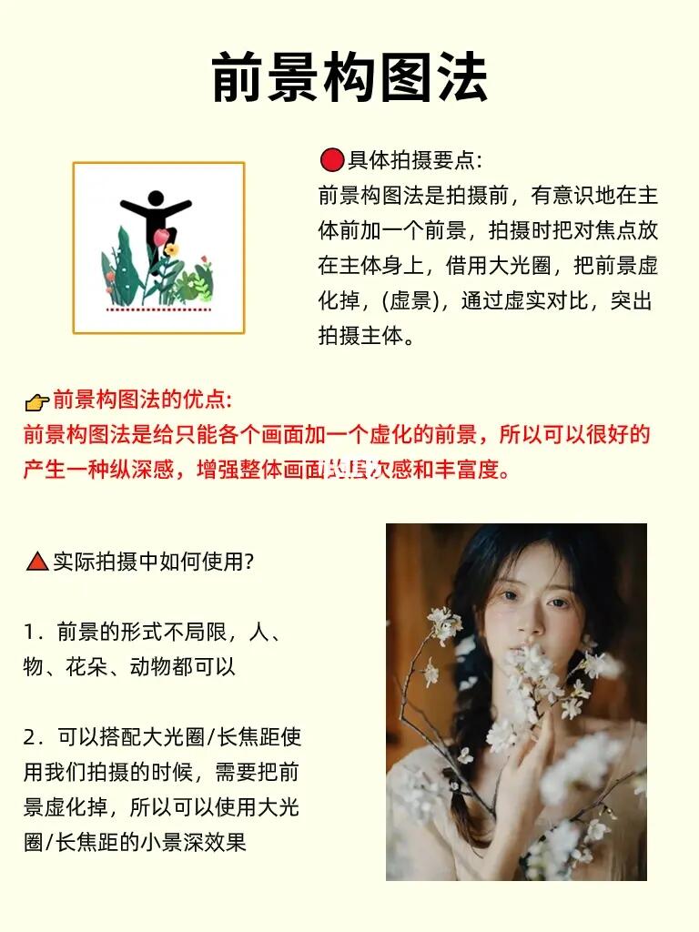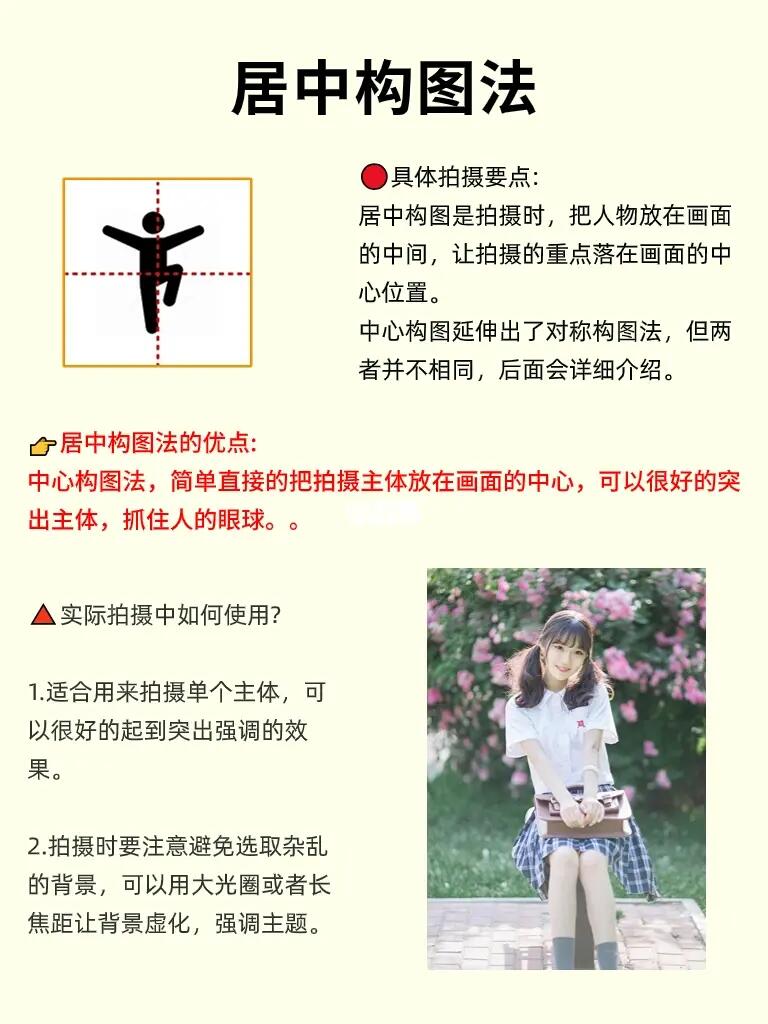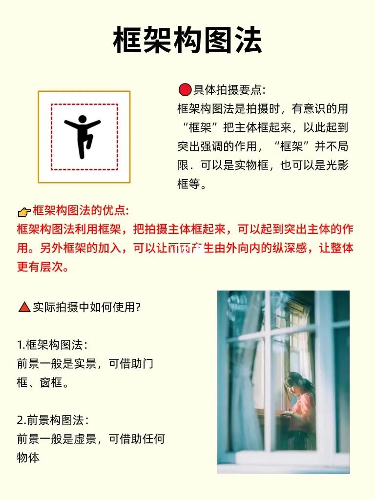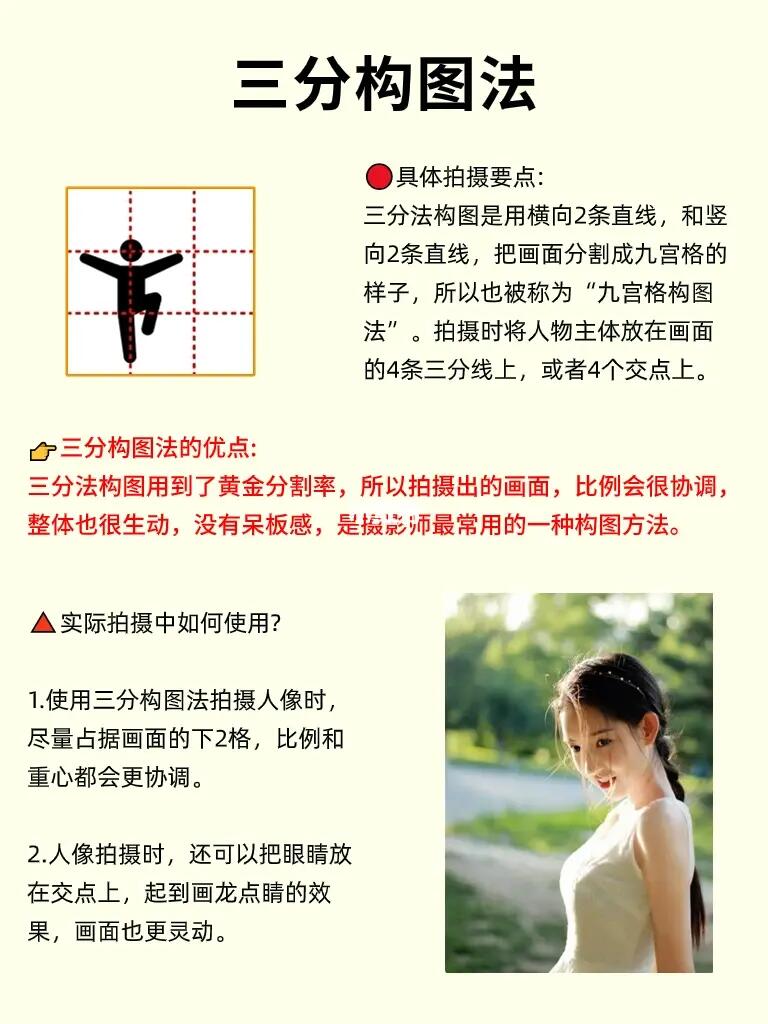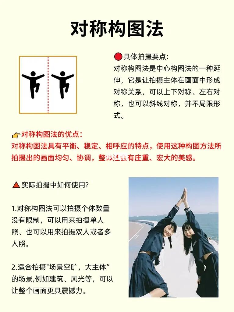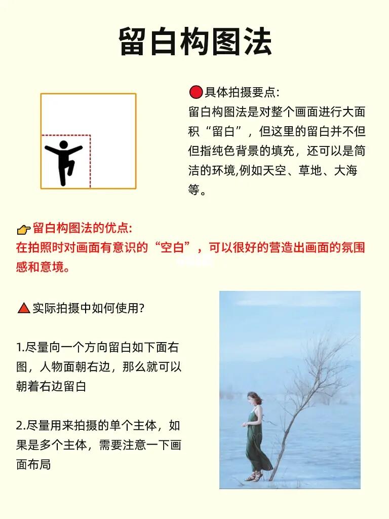 摄影小白一定要看!! 摄影创作离不开构图,就像写文章离不开布局和章法,谱曲离不开音符的编排一样,今天就来和大家分享9种非常实用的构图技巧。 - [一R]三分线构图法 [二R]三角形构图法 [三R]留白构图法 [四R]对角线构图法 [五R]对称构图法 [六R]前景构图法 [七R]引导线构图构图法 [八R]框架构图法 [九R]中心构图法 - 具体的拍摄要点,还有运用方法,我分享整理在图片里啦,希望可以帮助到大家!