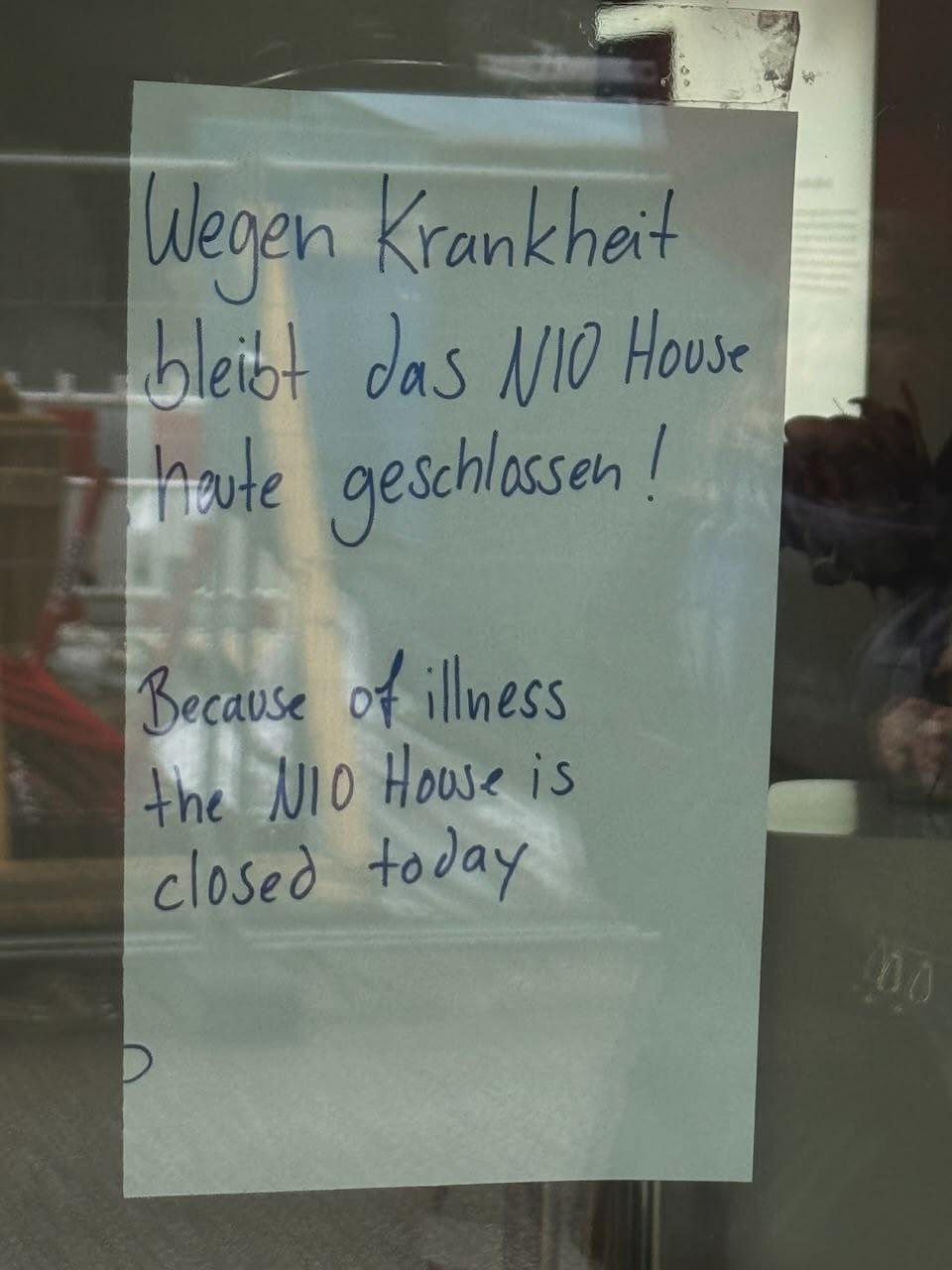 想要@蔚来 官方看看,海外车卖不好,是不是员工太懒散了。 上周六,汉堡蔚来中心本该是门庭若市、生意爆棚的节奏。 结果现场大门紧闭,只有一张告示冷冷写道:“因病今日闭馆”。 这……好歹把灯开着装一下呀。 大v聊车电车出海蔚来 【来自懂车帝车友圈】