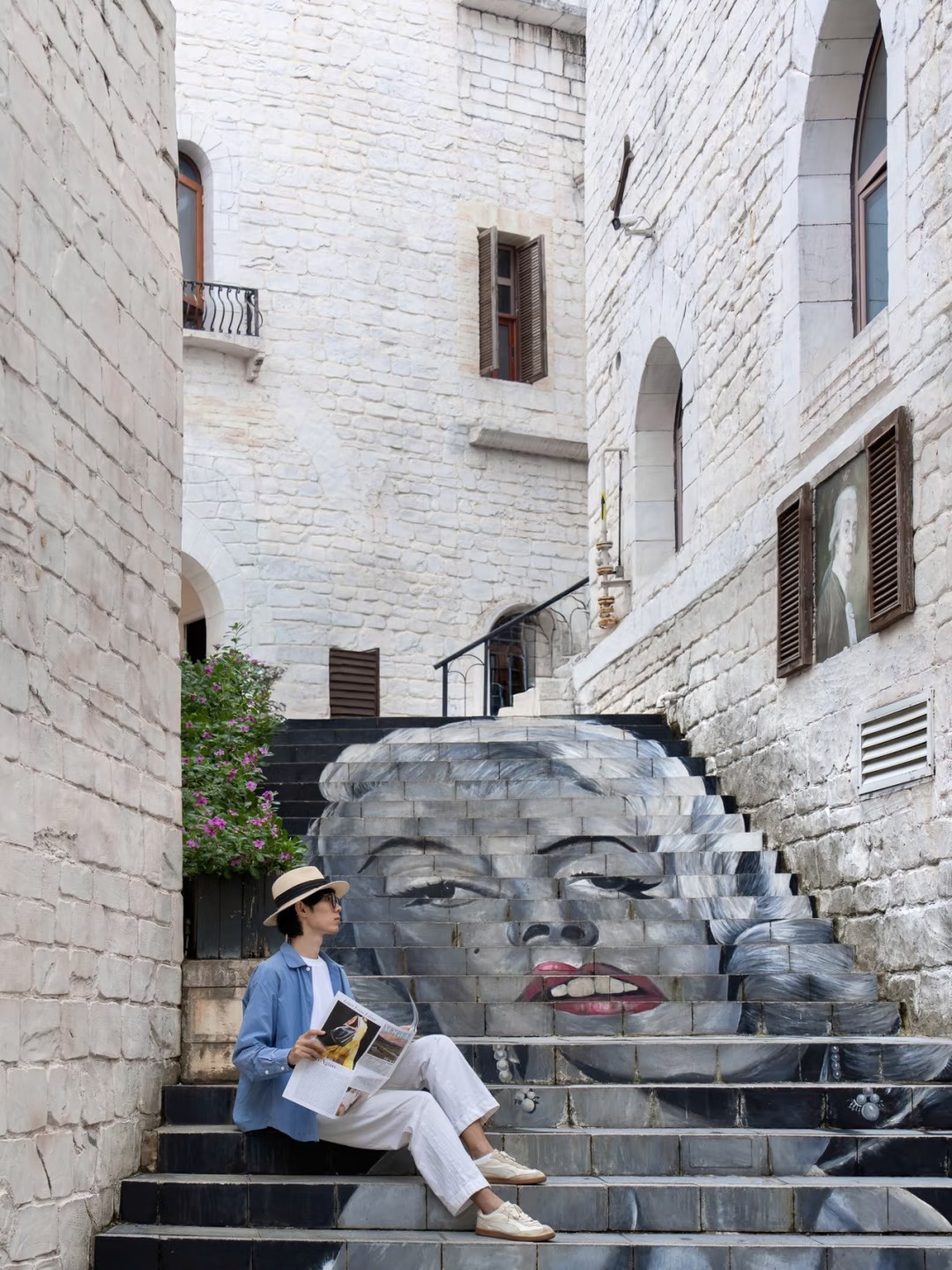 通往电影工坊的路上,在被电影海报的阶梯,与玛丽莲梦露合个影