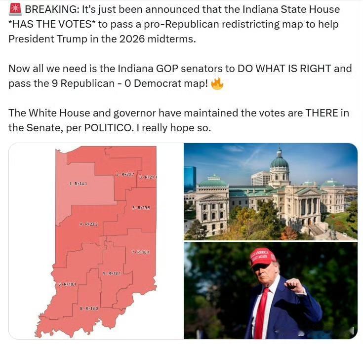 印第安纳州州议会宣布已有足够票数通过一项有利于共和党的重新划分选区地图,以助特朗普总统在2026年中期选举中获胜。 现在只需要印第安纳州共和党参议员们 做正确的事,通过9个共和党,0个民左党的地图!