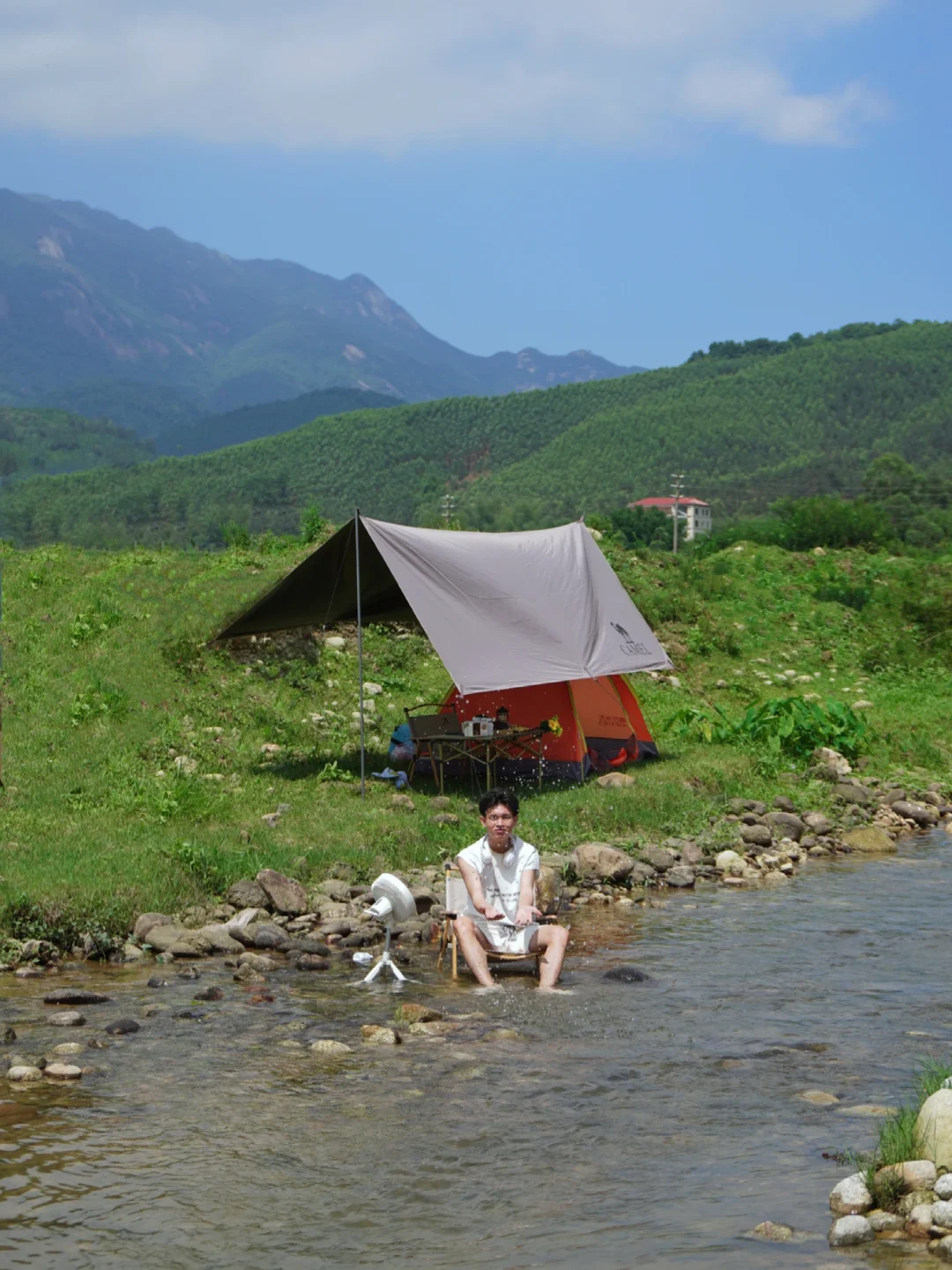 不偏,就在山脚下的小村庄,小溪大概有1-2公里长,有很多大小石头跟小鱼抓,岸的两边都能露营。