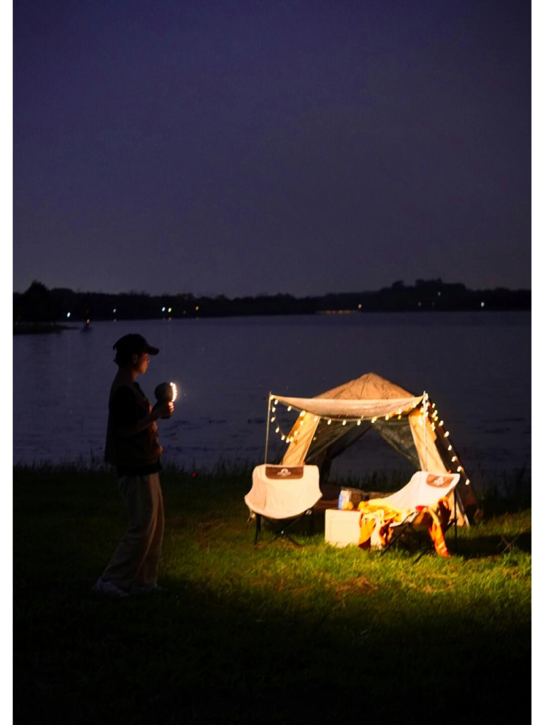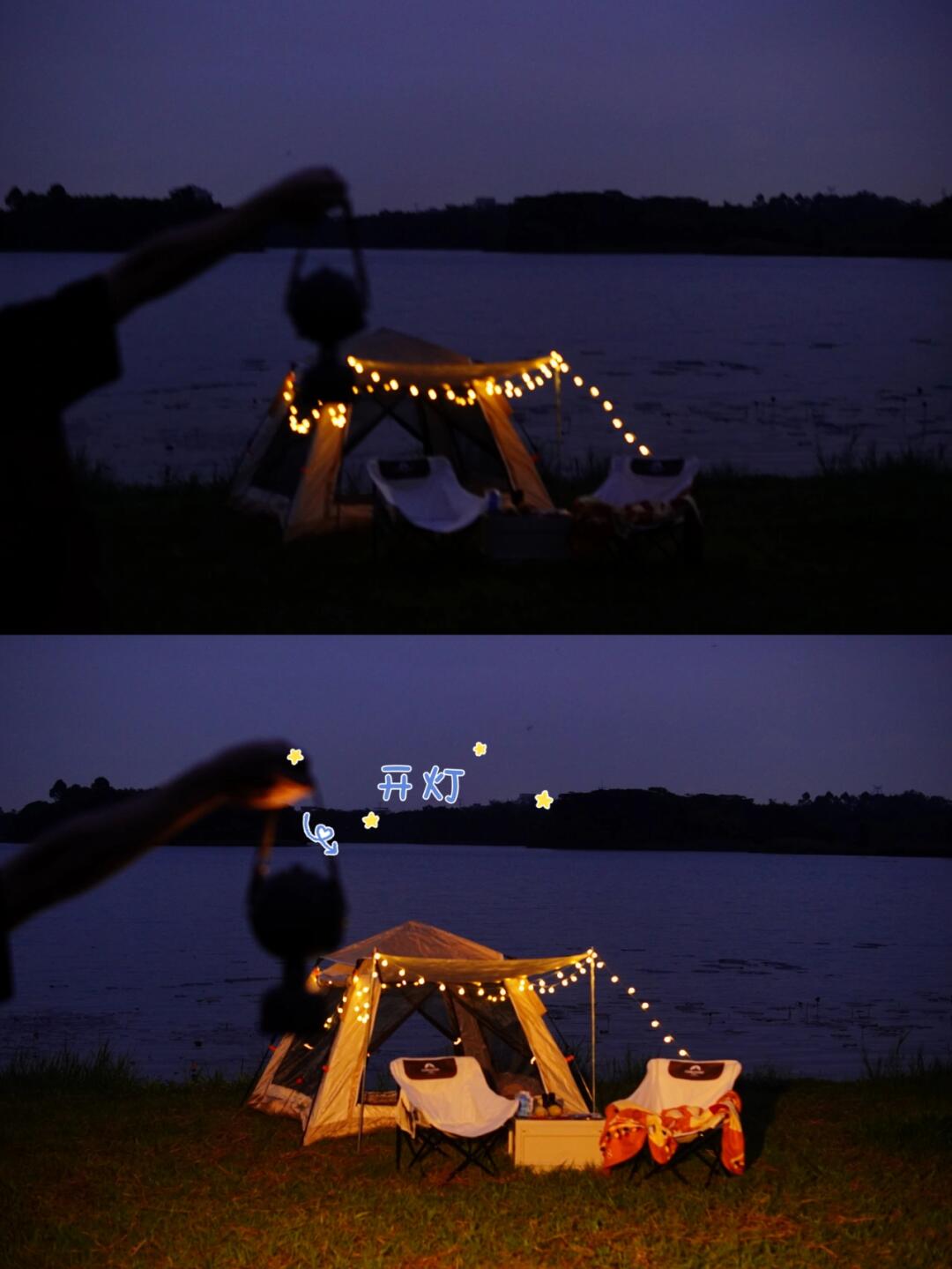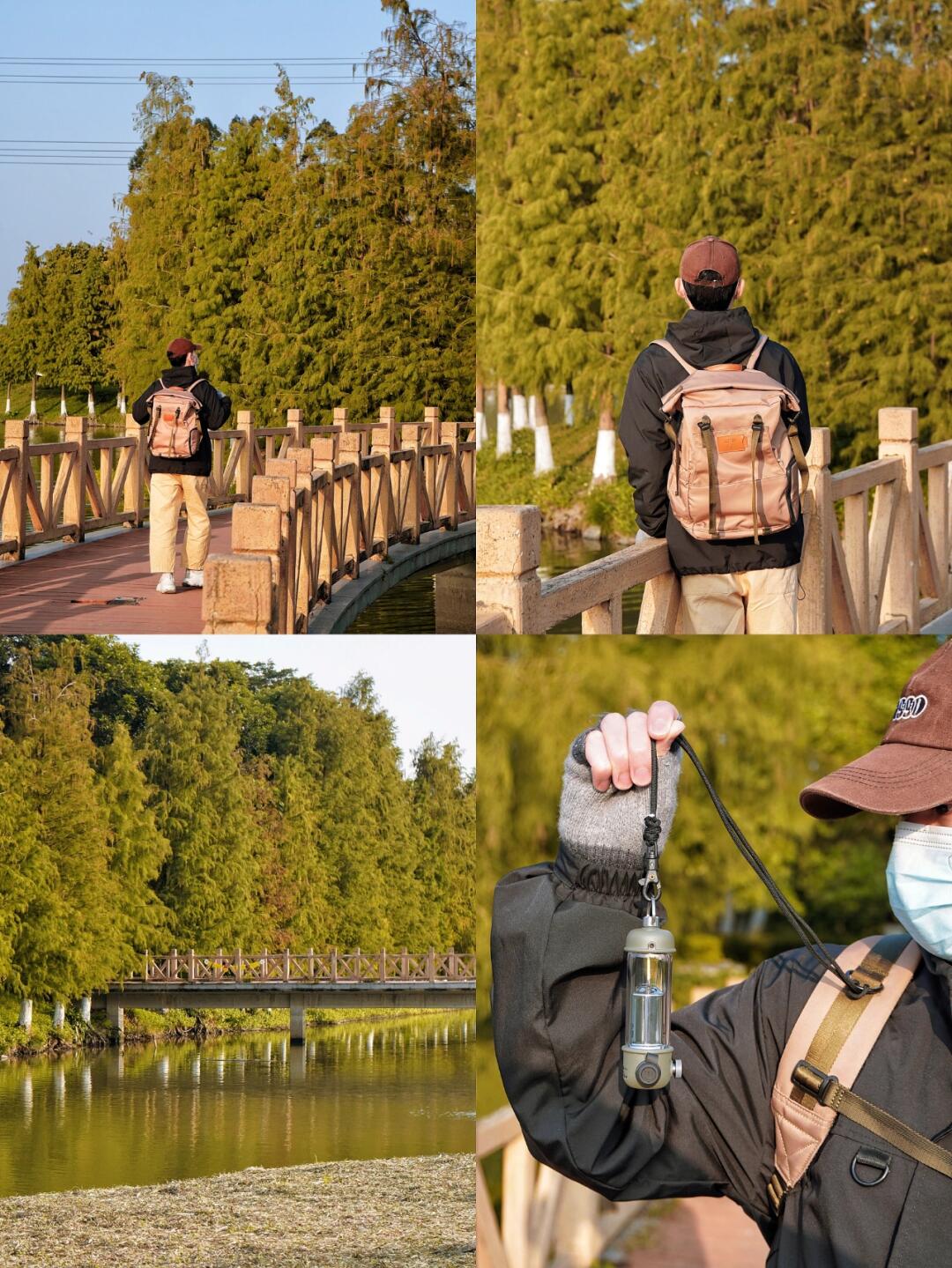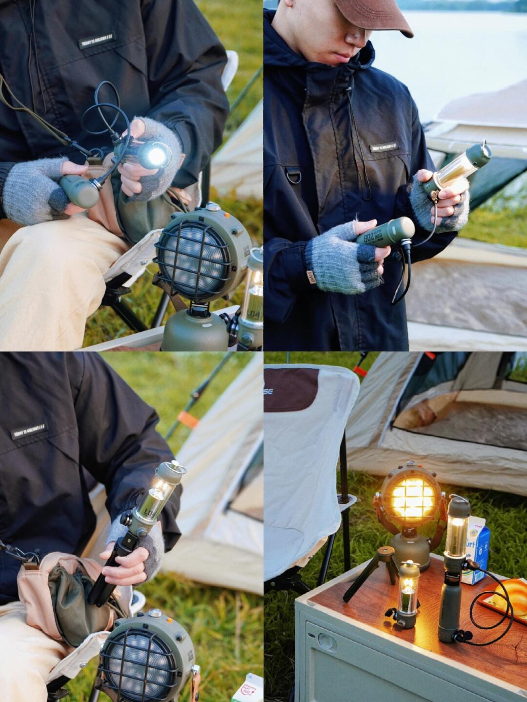 2⃣露营建议一定要带齐灯具,公园晚上关线很暗。我带了一套参加洛斐新品发布会时的一套撒野系列灯具有手电筒、氛围灯、大灯、柱状电源、三脚架,绳子等等。部件是可以随意搭配,机能风满满。