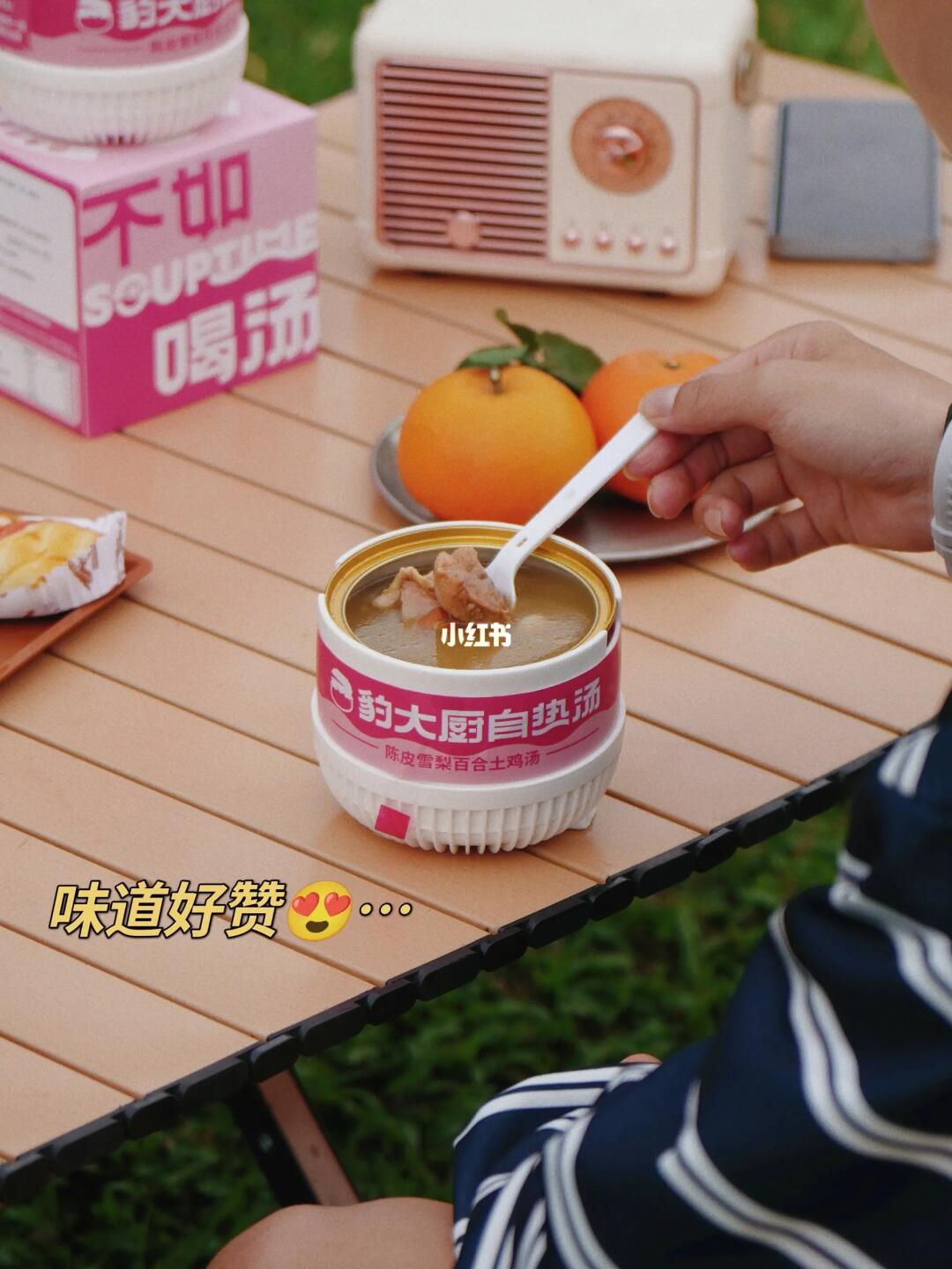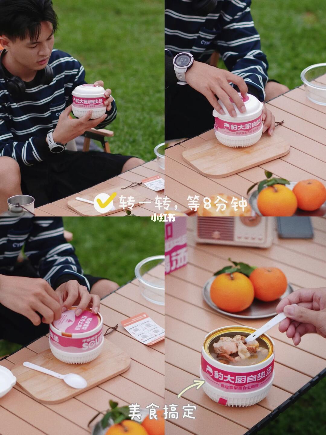 2⃣️虽然只能野餐,但是大家还是可以带一些方便的速食来吃,除了一些水果甜品外。我这次带的豹大厨陈皮自热土鸡汤,扭一扭等8分钟,一碗养生的正宗广式土鸡汤就做好啦!