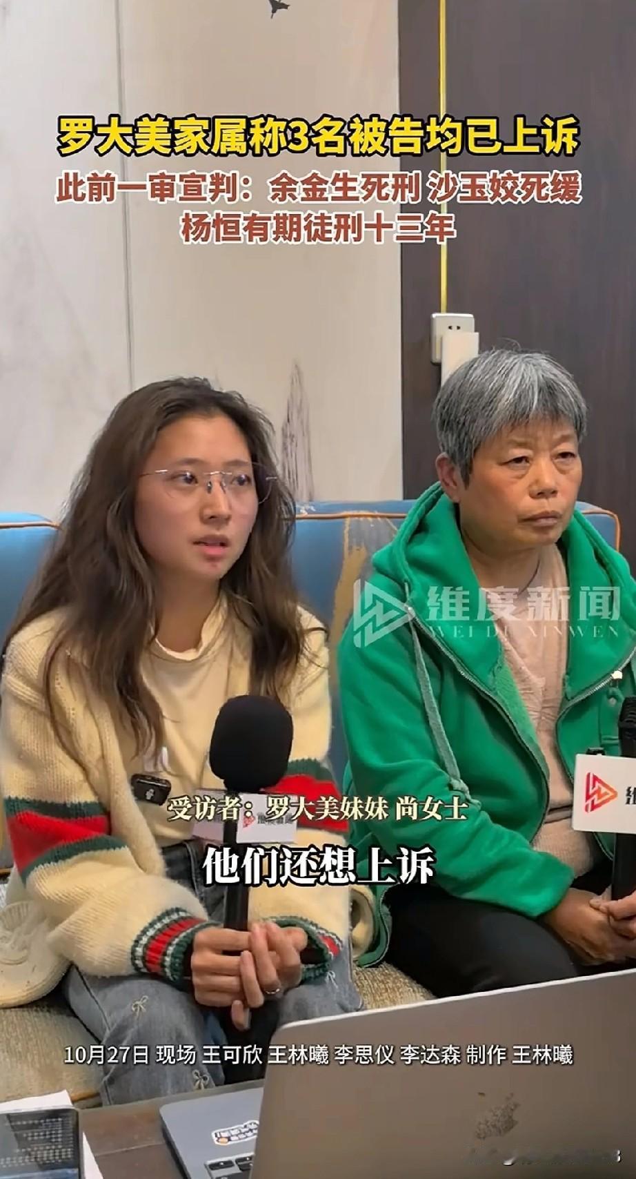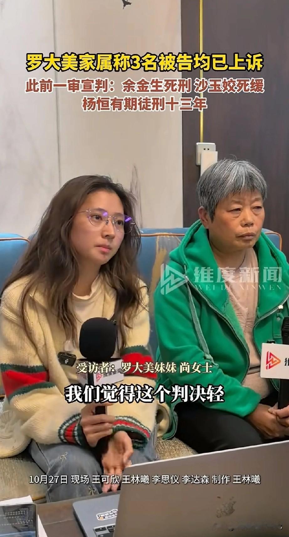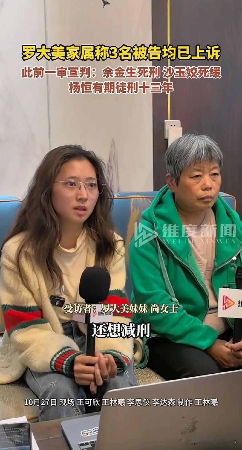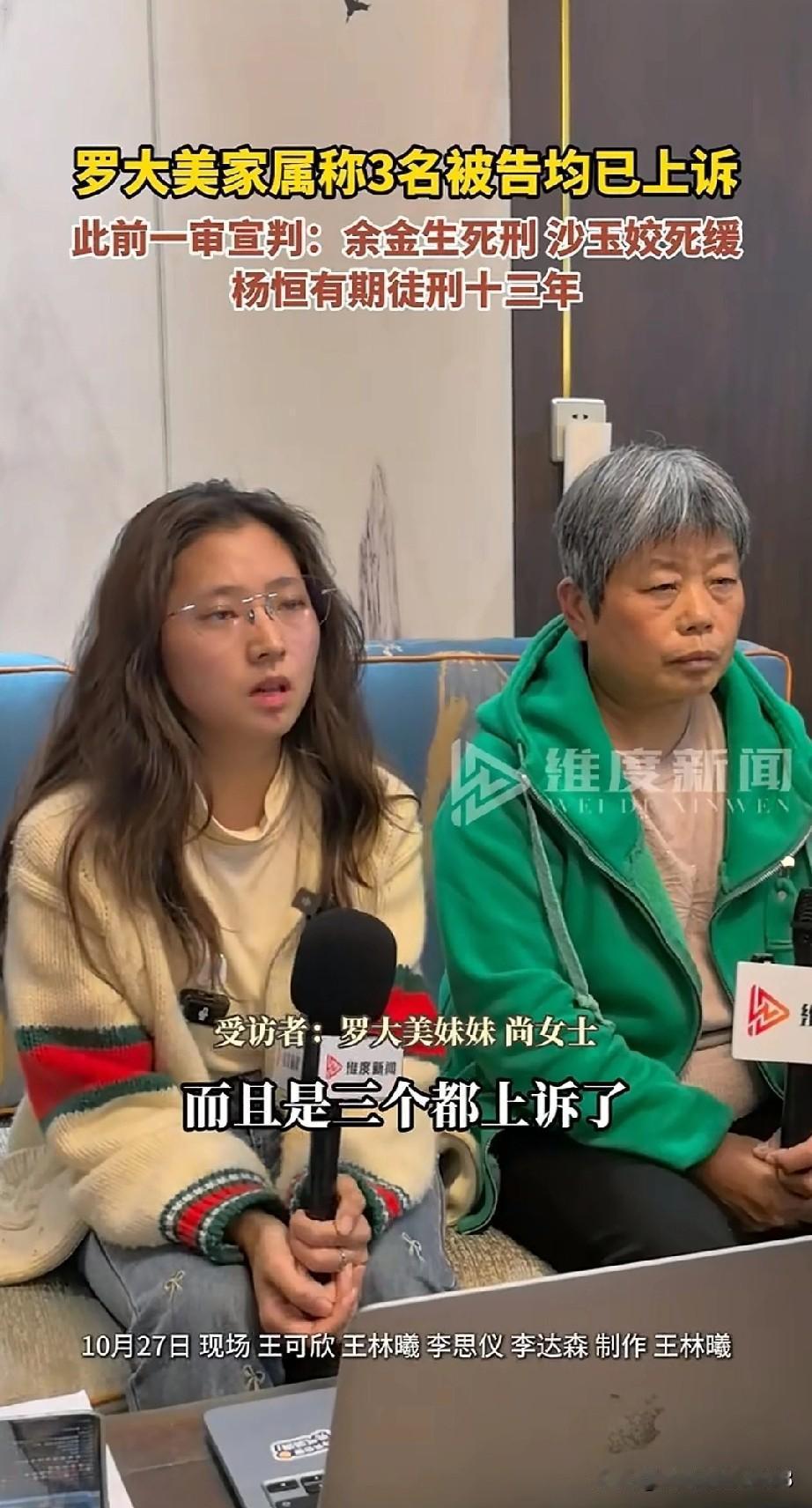 罗大美案最新消息,罗大美的妹妹说目前三名被告都已经上诉了!对于罗大美的家属他们来说,觉得这个判决结果是判轻了,可是对于这三名被告来说,他们觉得很重,他们还想上诉,还想减刑! 此前判决结果,三名被告一个死刑,一个死缓,一个有期徒刑13年。 现在罗大美的家属已经申诉了,三名被告也都已经上诉了,双方都觉得判决结果不公! 此事不知道大家怎么看?