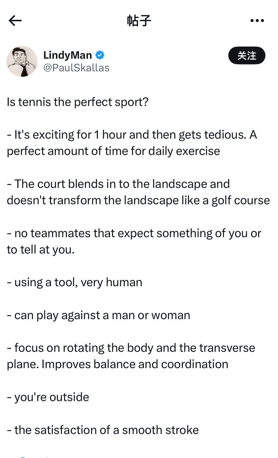 今日推上的一个热帖:网球是不是最完美的运动?发帖的博主给出的理由是——