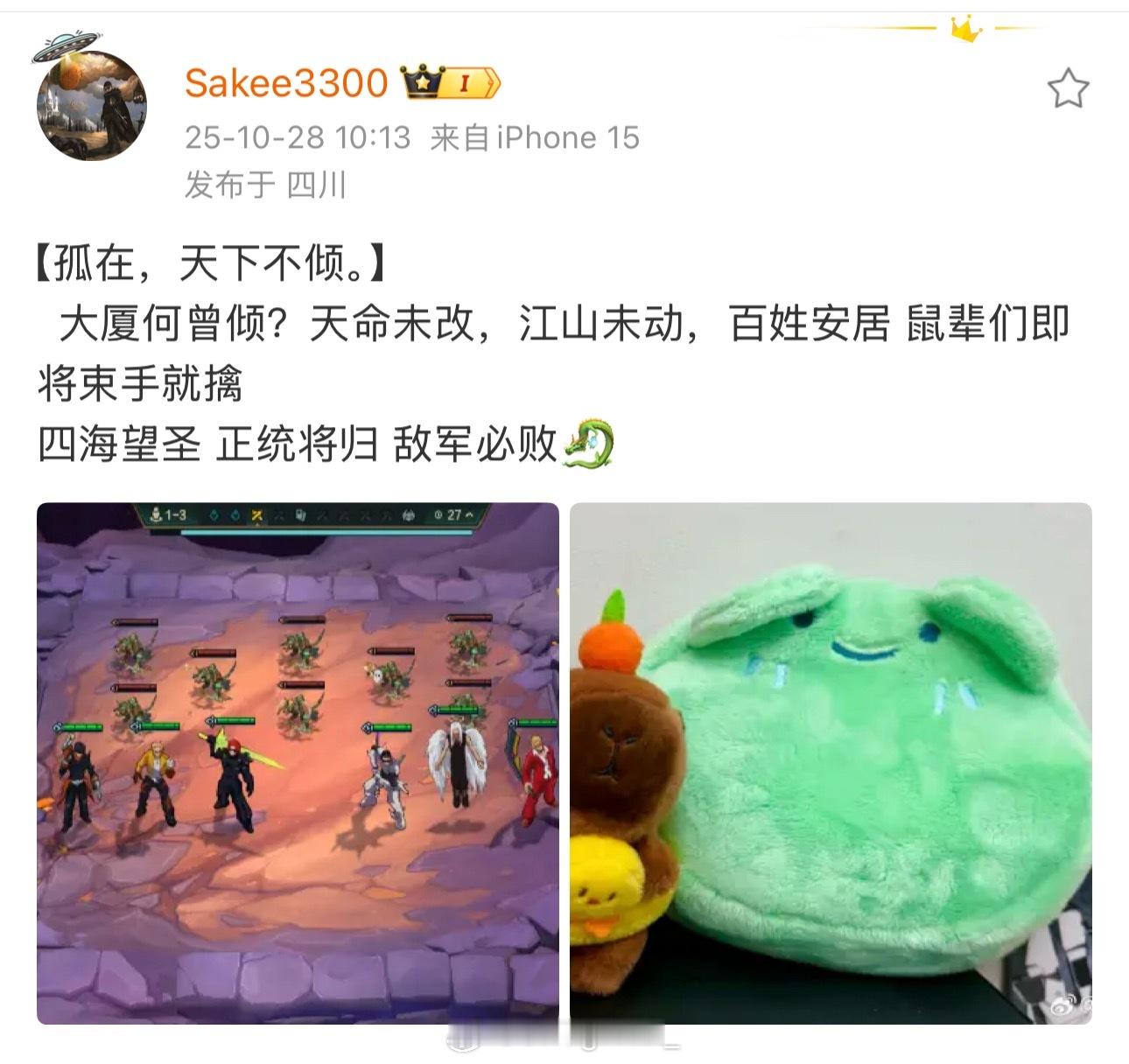 Sakee再度喊话:【孤在,天下不倾。】 大厦何曾倾?天命未改,江山未动,百姓安居 鼠辈们即将束手就擒 四海望圣 正统将归 敌军必败🐉