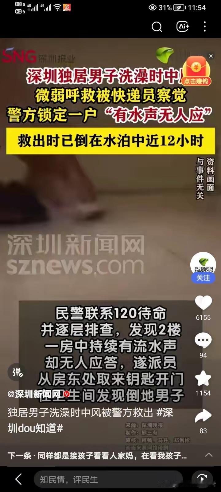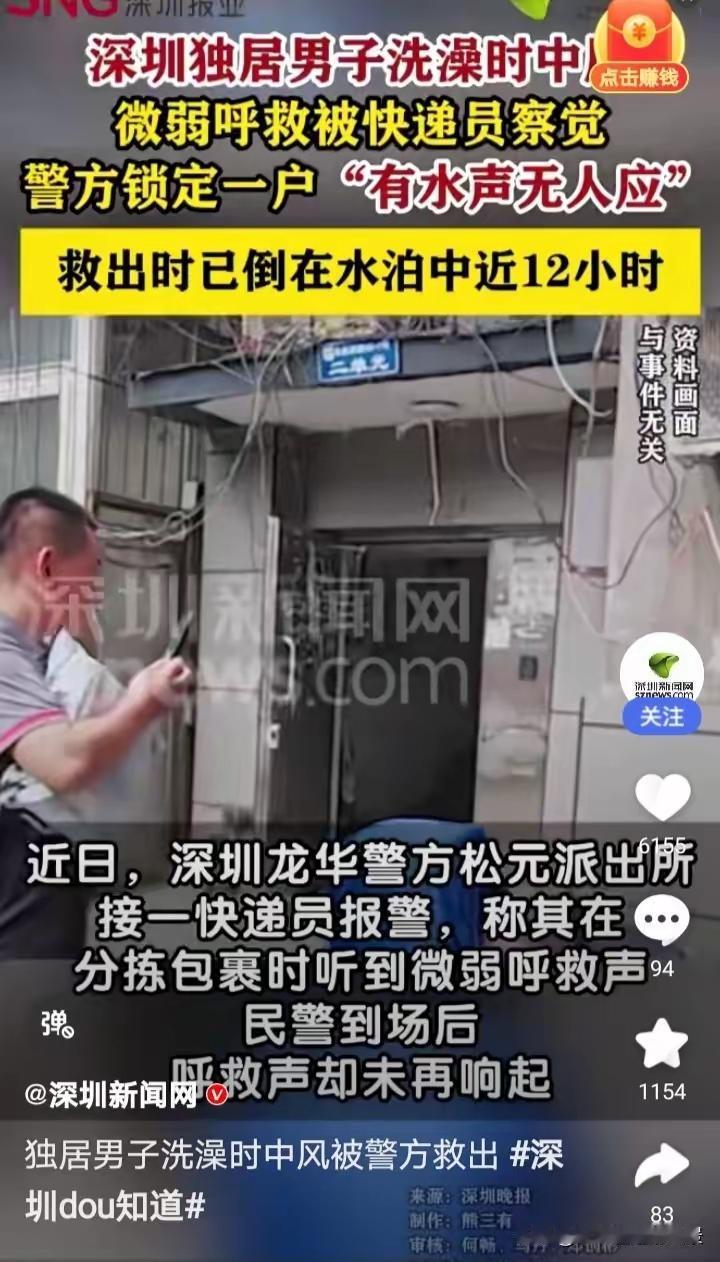 近日,深圳龙华松元派出所接到了一名快递员的报警,称其在分拣时听到有微弱的呼救声,等民警到场后呼救声却再未响起。 民警立即联系120待命,并逐步排查整栋楼,最后发现2楼一房中有持续的流水声,敲门却无人应答,民警立即联系上了房东,并派人去房东处取来了钥匙开门,一进门就发现了在卫生间倒地的男子。 有网友说:点外卖的人以后不要再给快递小哥差评了,全国已经出现很多见义勇为外卖小哥!向勤劳的外卖小哥们致敬! 好人好报。该说不说,外卖员快递员就是一个城市的流动救助站。他们每天这个城市每个角落要穿梭上万次。 深圳龙华松元派出所警察尽职敬业,对快递小哥的报警非常重视,逐户排查,他们共同挽救了一条生命。值得向全社会宣传! 试问现有多少已工作的孩子能天天陪伴父母身边?更有不少异国他乡远离父母的儿女。而老人家的突发状况无时不在,防不胜防!问题是怎么能及时发现突发异常并及时得到处理。这是群体性问题,得群策群力。 大家怎么看呢?