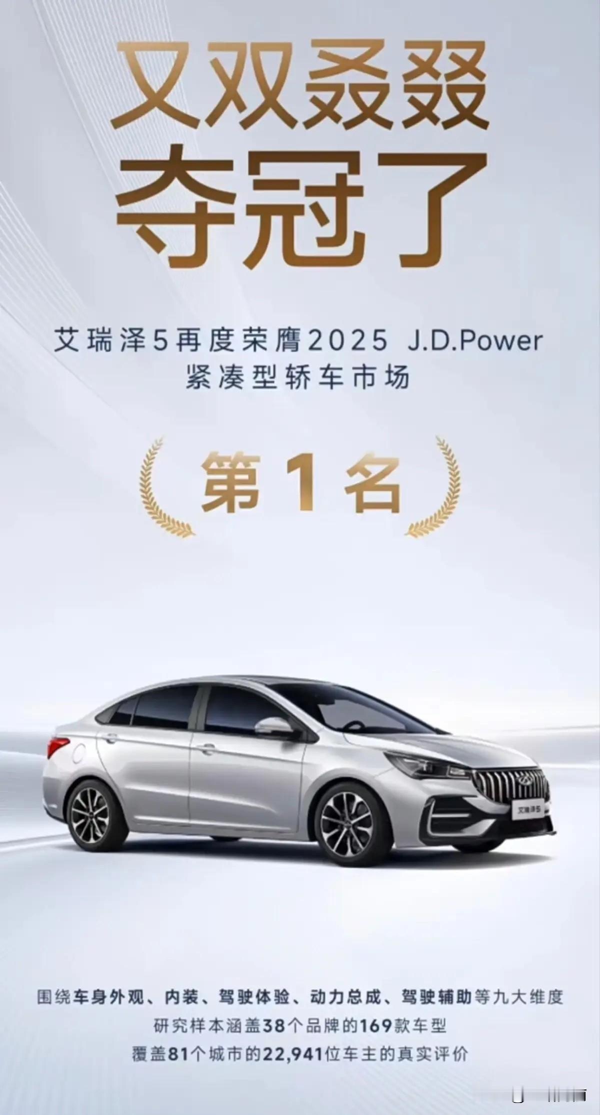 尹同跃总、余承东、王传福各位大佬都看看!奇瑞这波真给自主品牌长脸了,几万块的艾瑞泽5,居然在2025年J.D. Power中国车辆可靠性研究里,拿下了紧凑型轿车市场第一名!这成绩可比堆配置、拼参数实在多了。 关键这奖含金量真不低,J.D. Power的车辆可靠性研究(VDS)可不是看新车好不好,而是盯着拥车13到48个月的老车主反馈,查的是长期用出来的真质量。要知道今年整个燃油车市场质量都在滑坡,行业平均问题数还涨了7个PP100,艾瑞泽5能在这种环境下夺冠,简直是逆势突围。 更绝的是它的身价,2025款手动挡才5.99万起,CVT版也才6.99万,就是妥妥的入门级家轿价格。但质量硬到能经住出租车司机的考验,有车主开它跑了26万公里,发动机还照样健康;厂家更是敢给发动机质保百万公里,这底气可不是吹出来的。对比同级别合资车,要么配置减到只剩壳子,要么价格贵出一大截,艾瑞泽5这性价比直接拉满。 其实这不是艾瑞泽5第一次拿奖了,2023年就拿过J.D. Power新车质量冠军,现在又把长期可靠性冠军收入囊中,等于新车和老车的质量都经住了考验。能做到这点,全靠奇瑞的硬功夫:车身用C-NCAP五星标准的笼式结构,还过了24万公里超国标3倍的耐久测试,连底盘都做了全装甲喷涂和空腔注蜡,十年防腐防锈不是空话。 说真的,现在车市天天比智能、拼加速,但对大多数普通人来说,皮实耐造、用着省心才是刚需。艾瑞泽5就精准踩中了这点,不搞花里胡哨的噱头,把钱花在发动机、车身这些核心部件上,难怪能赢过一堆竞品。这也印证了奇瑞能拿自主品牌可靠性第一,还实现五大权威榜单"大满贯"不是偶然。