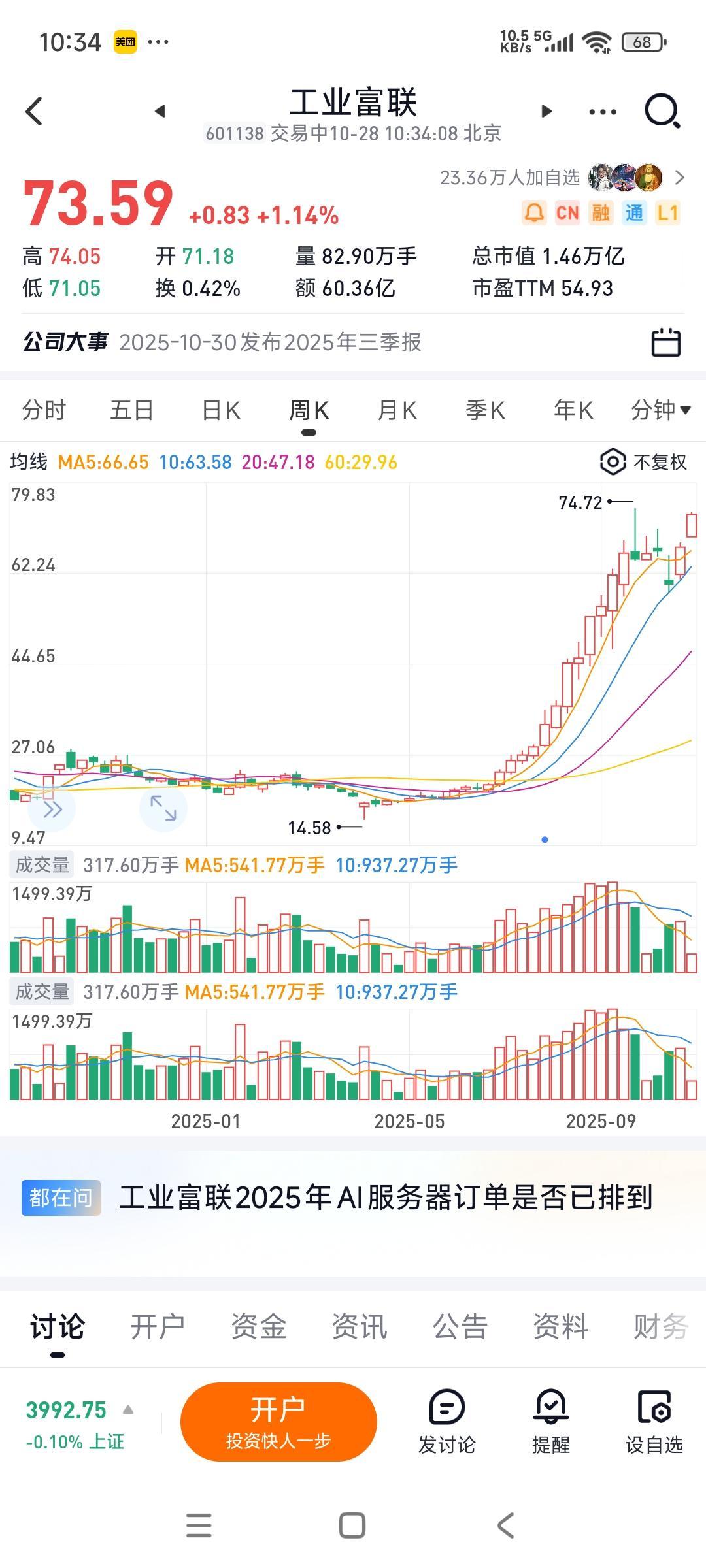 工业富联又要创新高了,市值1.46万亿,估值55倍...相比之中兴通讯,中兴通讯给它提鞋的机会都没有,中兴通讯市值才2400亿(不到),不及人家一个零头,估值30倍,市场都不愿意给高估值[捂脸]...差距太大了...