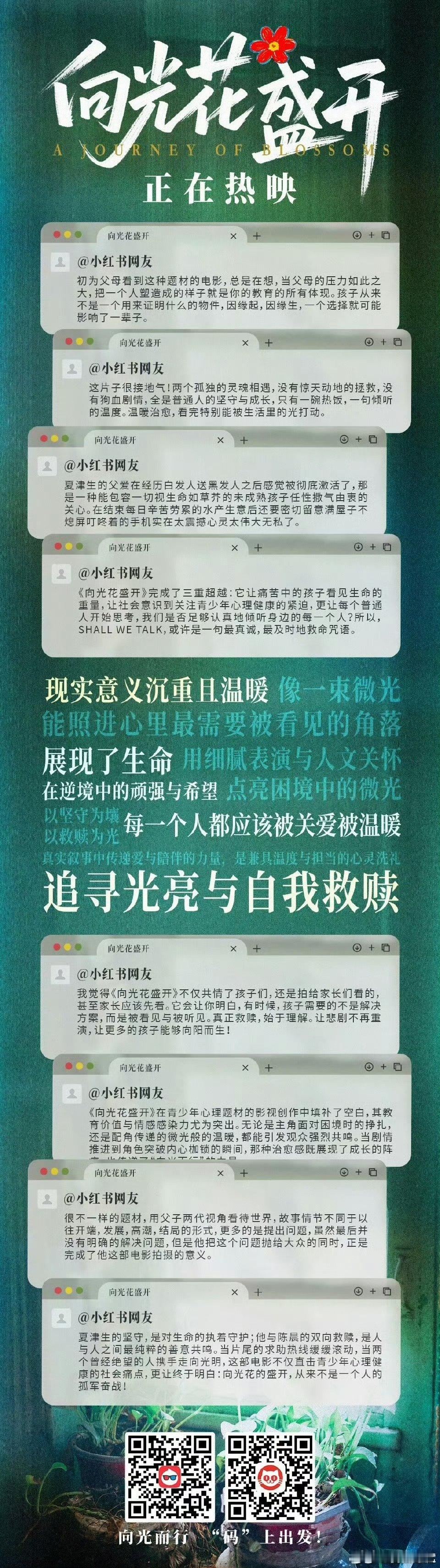 向光花盛开上宣实力这一块 不贩卖焦虑,只传递温暖。影片把青少年心理问题拍得真实不刻意,丧父与丧子的灵魂相拥,是十月最戳心的治愈。电影向光花盛开