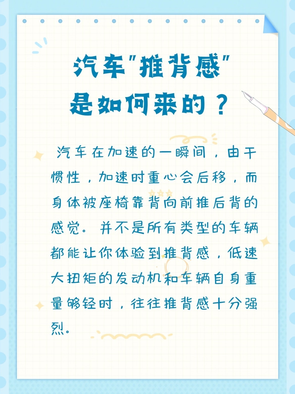 什么是汽车的“推背感”?简单说,就是急加速时,惯性让你紧贴座椅靠背的那种感觉。车子扭矩越大、自身越轻,推背感就越强。所以性能车推背感十足,而普通家用车就比较温和啦。