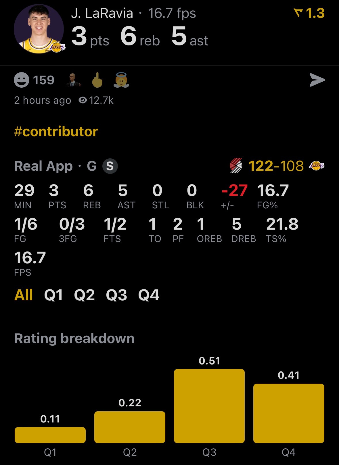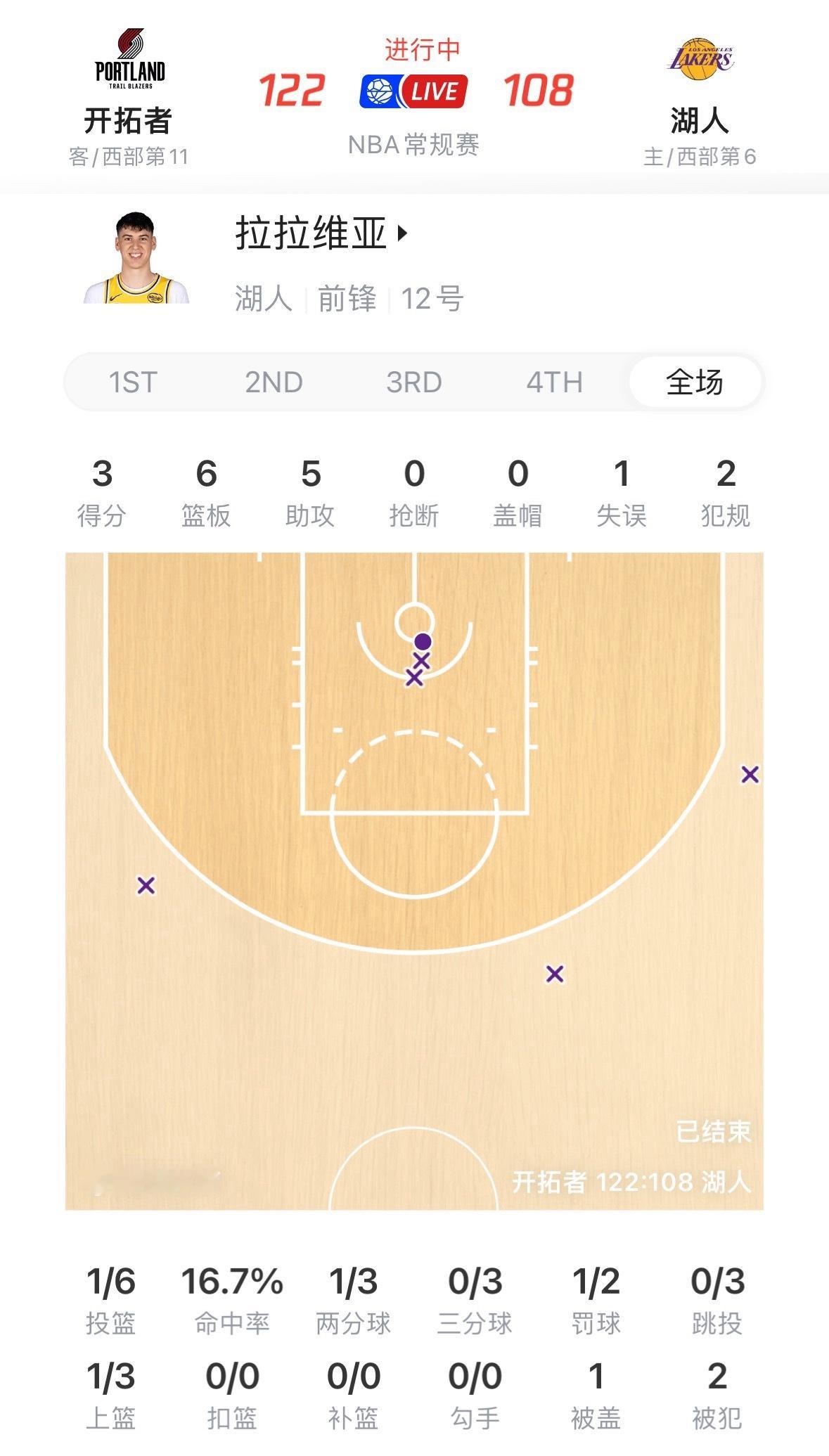 拉拉维亚29分钟3分6板5助攻,投篮6投1中,三分3中0,正负值-27。下场加油,需要努力了。