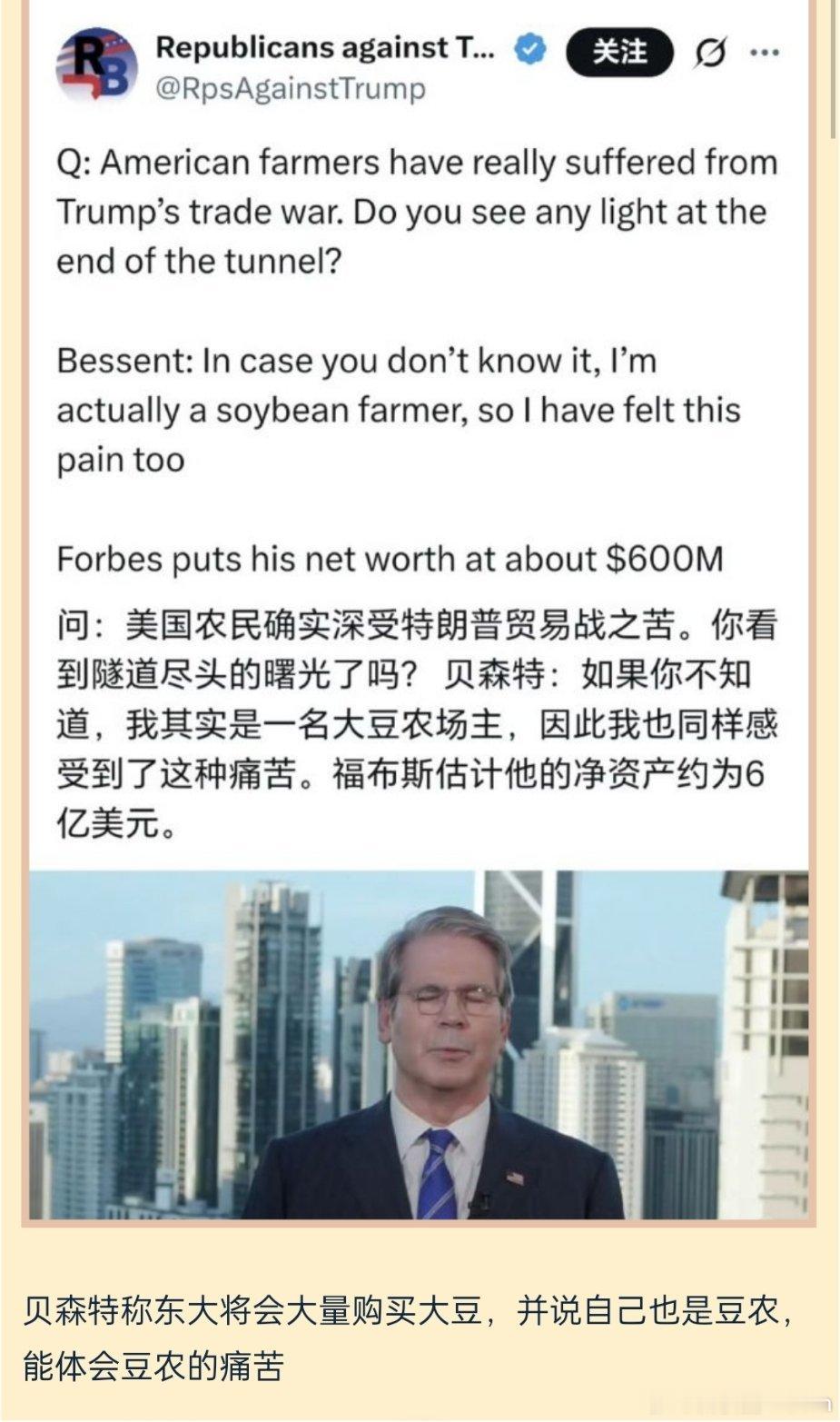 🔻贝森特说:其实我也是一名豆农,我能感受到中国不买美国大豆的痛苦。[哆啦A梦吃惊][哆啦A梦吃惊]
