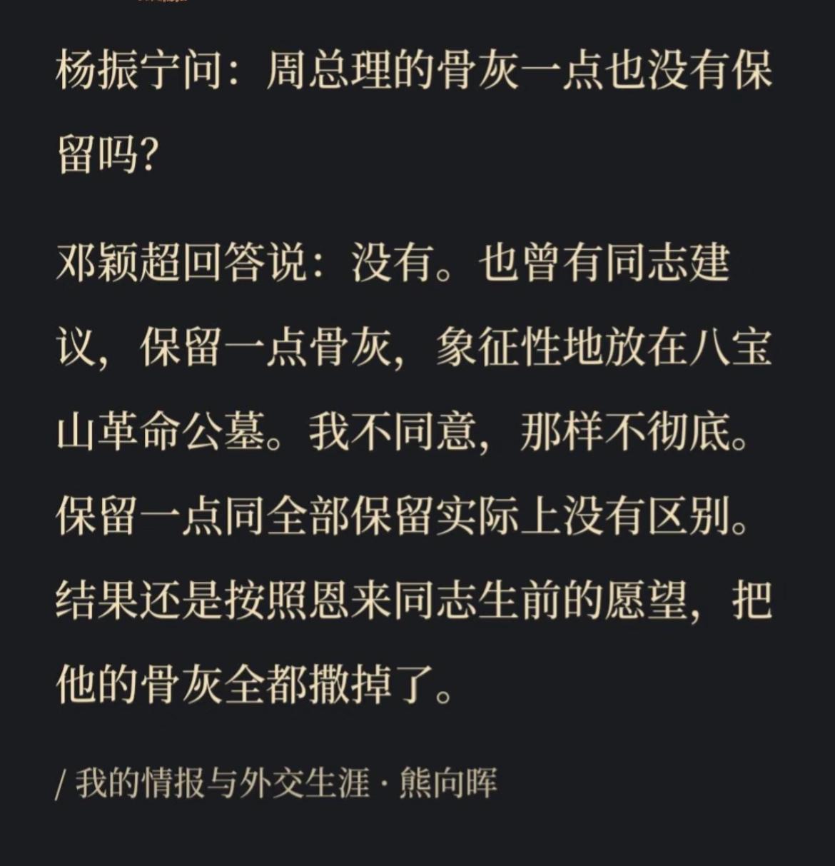 当年总理离世,杨振宁曾因为缅怀总理而在邓颖超面前失声痛哭。 他说自己对总理非常敬佩,听到总理辞世很悲痛,但听到总理遗言要把骨灰撒到祖国的江河和土地上尤其不能自控地难受。 邓颖超安慰他:我理解你,请不要难过。你是世界上著名的科学家,比我更懂得物质不灭的道理。我们党提倡遗体火化,但不要强加于人,这是一场革命,需要自愿带头。恩来同志交代我,死后不要增加活人的麻烦和负担,撒到江河里做鱼饲料,撒到耕地上做庄稼的肥料,虽然一点点,也许还可以最后起一点为人民服务的作用。 总理永远是人民的好总理。
