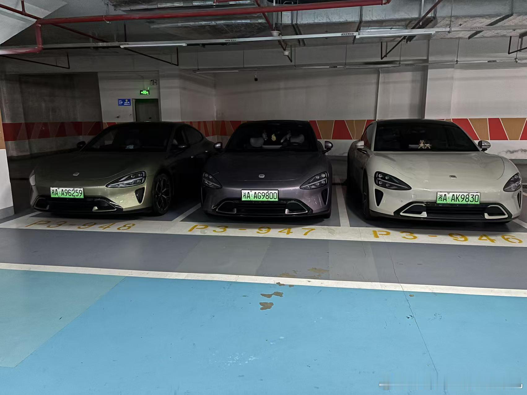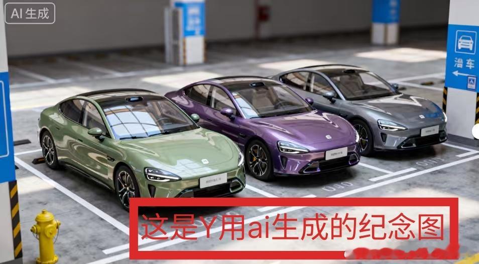 随后,Y也把自己的绿米开过去,出现了三台不同颜色SU7贴贴的场景(图一)。