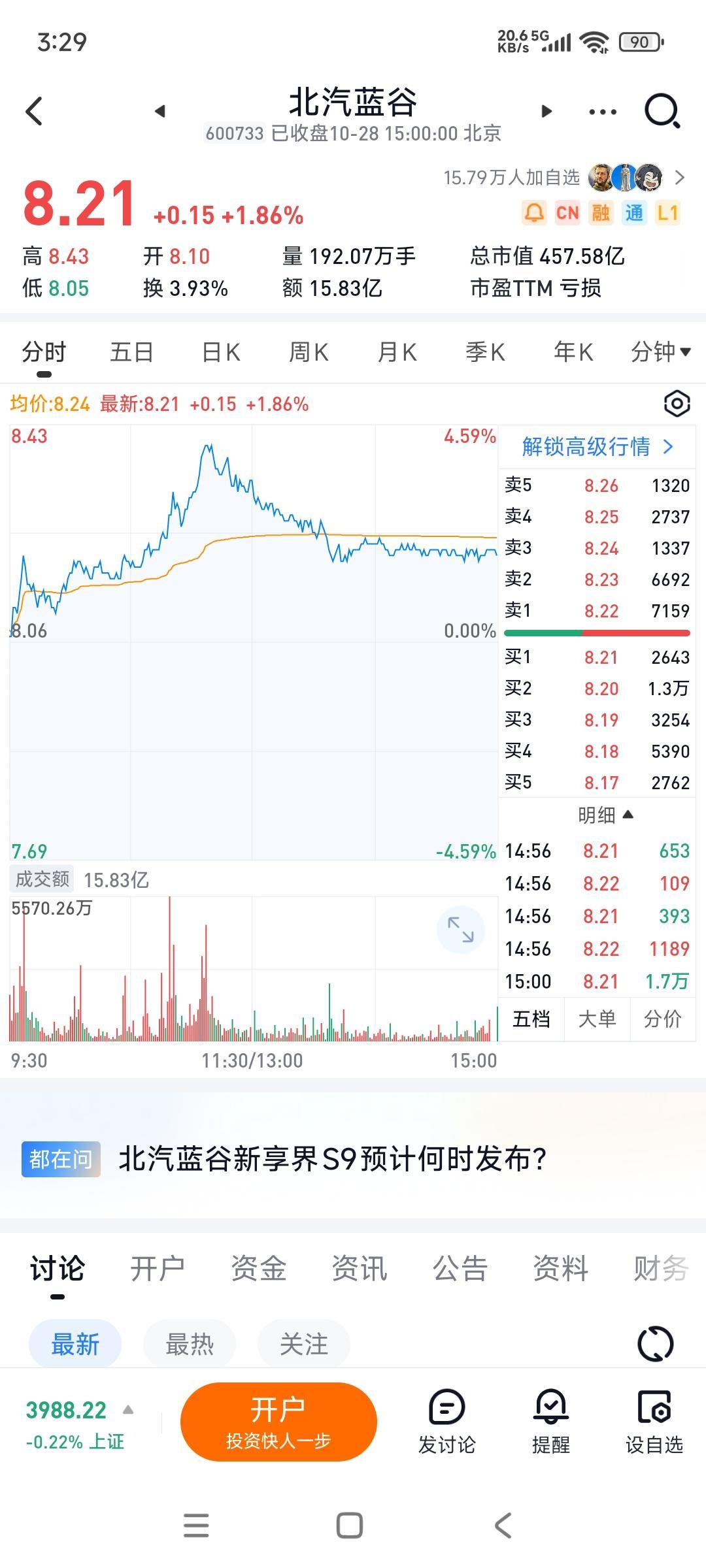 北汽蓝谷上到60日线附近就冲不上去了,随后跟着指数回抽... 不过今天它能红近两个点,也算不错了[捂脸]... 从二季度,三季度的业绩成绩来看,北汽蓝谷真的不应该只值8块钱,今年指数大涨的情况下,它的年线截止今天才微红2个多点...太不应该了... 随着四季度,享界车型交付量大增,四季度扭亏都很有希望... 我觉得年底应该可以涨到10块...