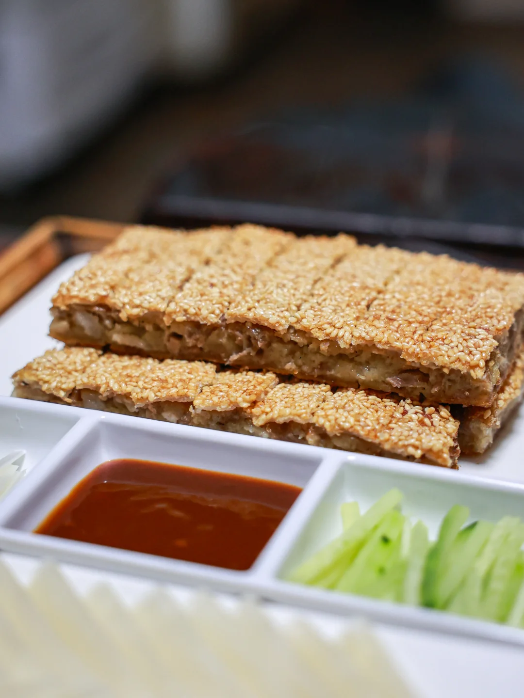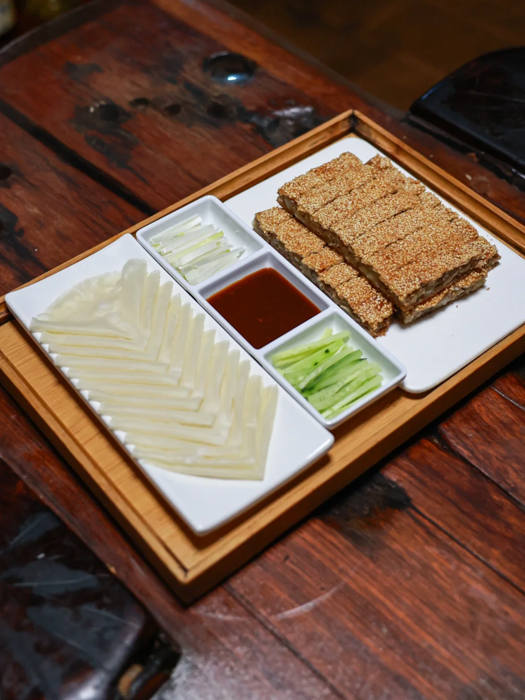 我感觉香酥鸭里面面粉加太多了,吃起来有点像街边卖的那种土家族烤饼的味道,鸭肉含量几乎没有。搭配的大豆酱混着黄瓜,包在饼皮里吃会削减几分面粉感,吃起来还算有滋有味。