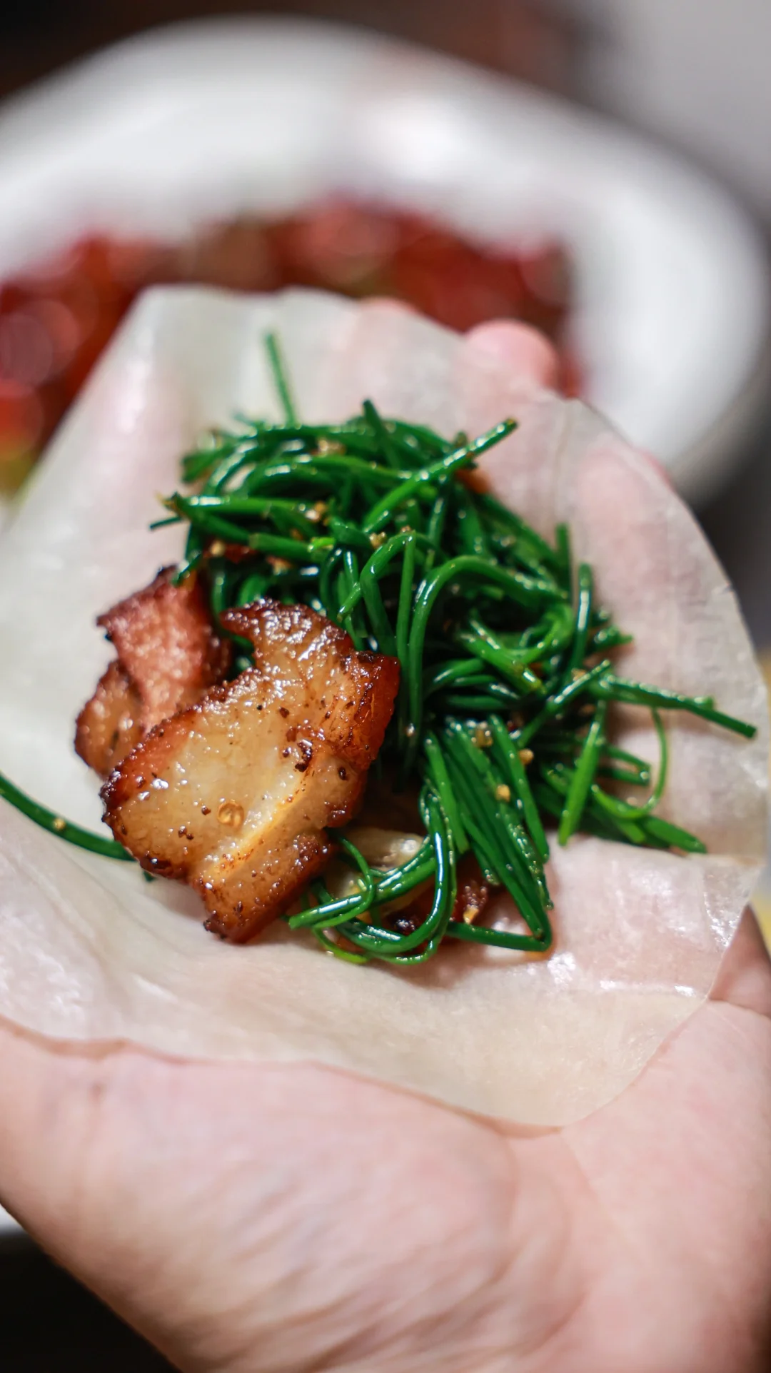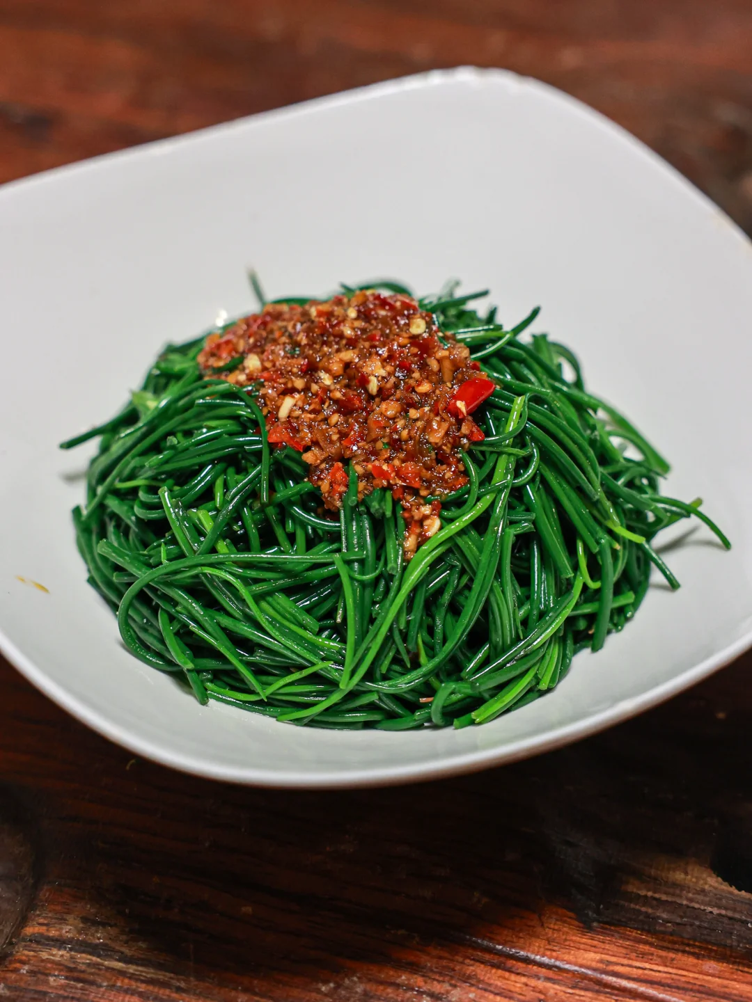 凉拌的沙葱,上面选择搭配的酱是类似潮汕的蒜蓉辣椒酱,而沙葱本身吃起来口感有点像豆芽,但口味又带点韭菜味和葱的淡淡辛香,拌着辣椒吃,咸味和辣味又上来了,挺好吃的。