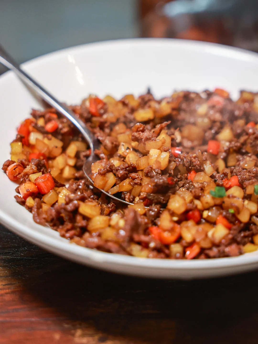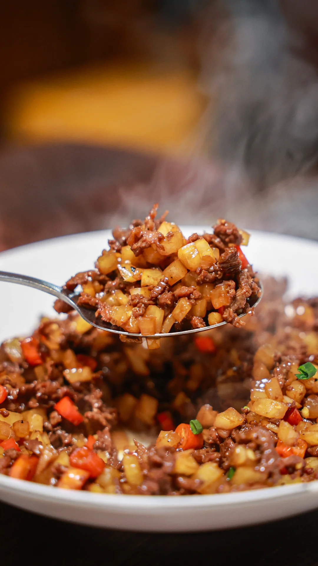 牛肉碎估计也是用油过了一遍,不是单纯的那种’小炒黄牛肉’的嫩感,稍稍带点焦香,小块的酸萝卜块就这牛肉,拌着小米辣,这一发入魂的含金量,湖南人都懂。