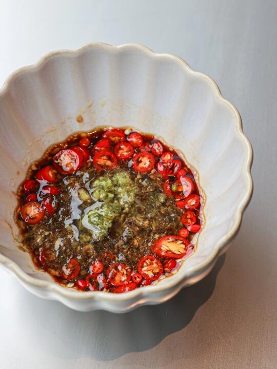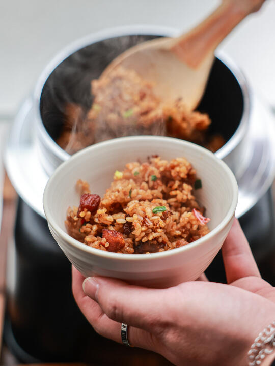 加入了常德炸辣椒与红烧鸡肉、再加鸡汤焖煮的釜饭,使得鸡的鲜味尽可能地被锁入米饭之中。不过光是鲜味肯定不对湖南人的胃口,香酥的炸辣椒和贵州脆哨的加入,倒是让米饭吃起来有滋有味多了。