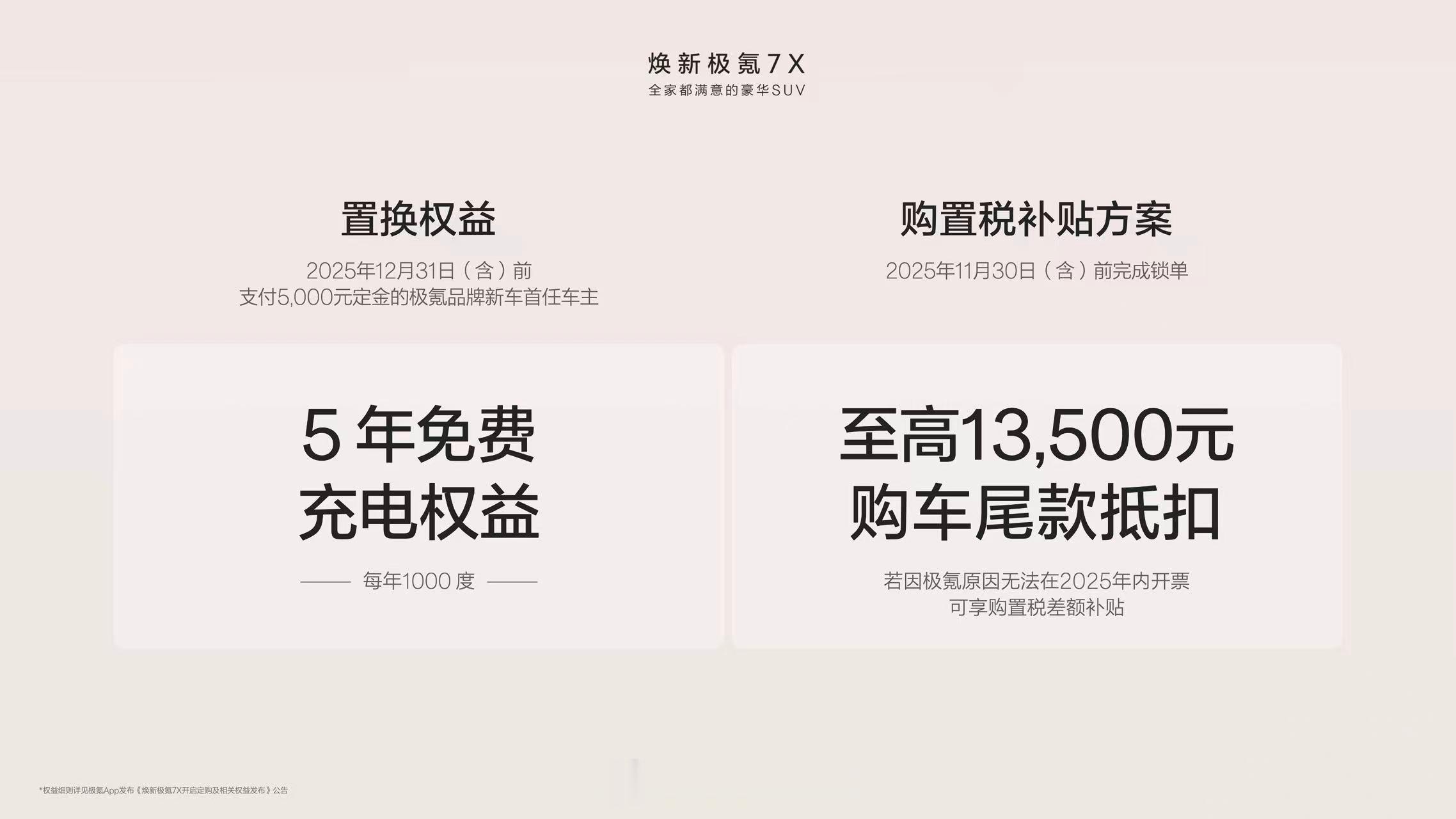 10月28日,焕新极氪7X正式上市,新车共推出75度后驱Max版 、103度后驱Max版、103度四驱Ultra版三款配置版型,官方零售价分别为229,800元、249,800元和269,800元,超级置换权益后限时售价219,800元起!