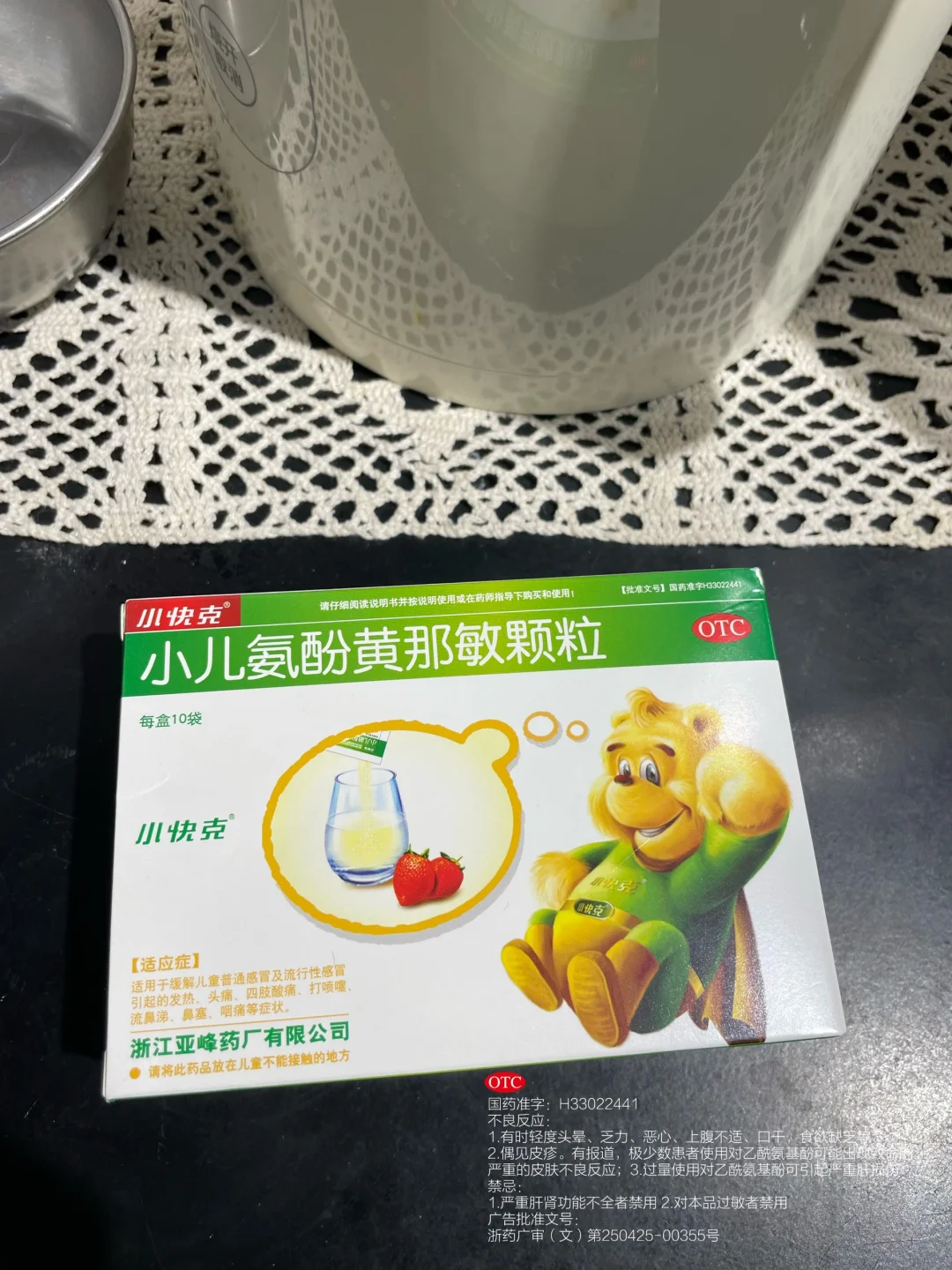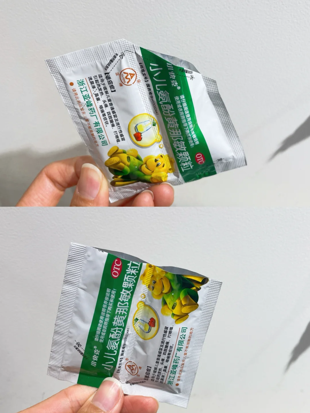 给哥哥吃了抗病毒药和退烧药后倒是缓上来点精神头,但鼻涕仍旧一直流,嗓子也痛痛的。想起家里还有之前哥哥感冒一直吃的小快克小儿氨酚黄那敏颗粒,赶紧给哥哥冲上一袋!