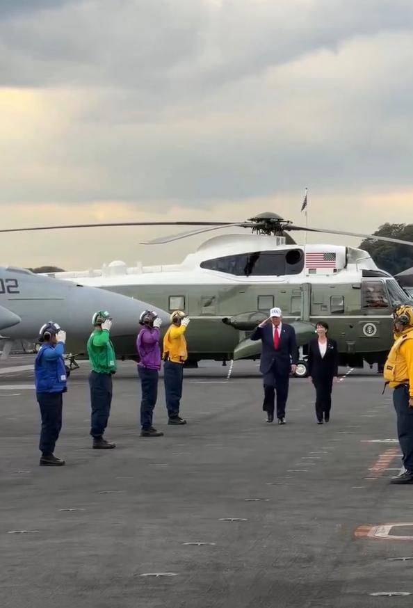 特朗普在高市早苗的陪同下,在美国第七舰队驻地横须贺海军基地参观华盛顿号航母。 特朗普说道:“美国和日本之间珍贵的联盟是全世界最杰出的关系之一,的确如此。”