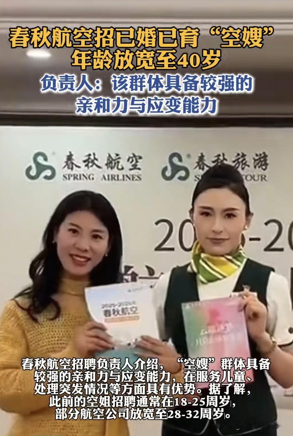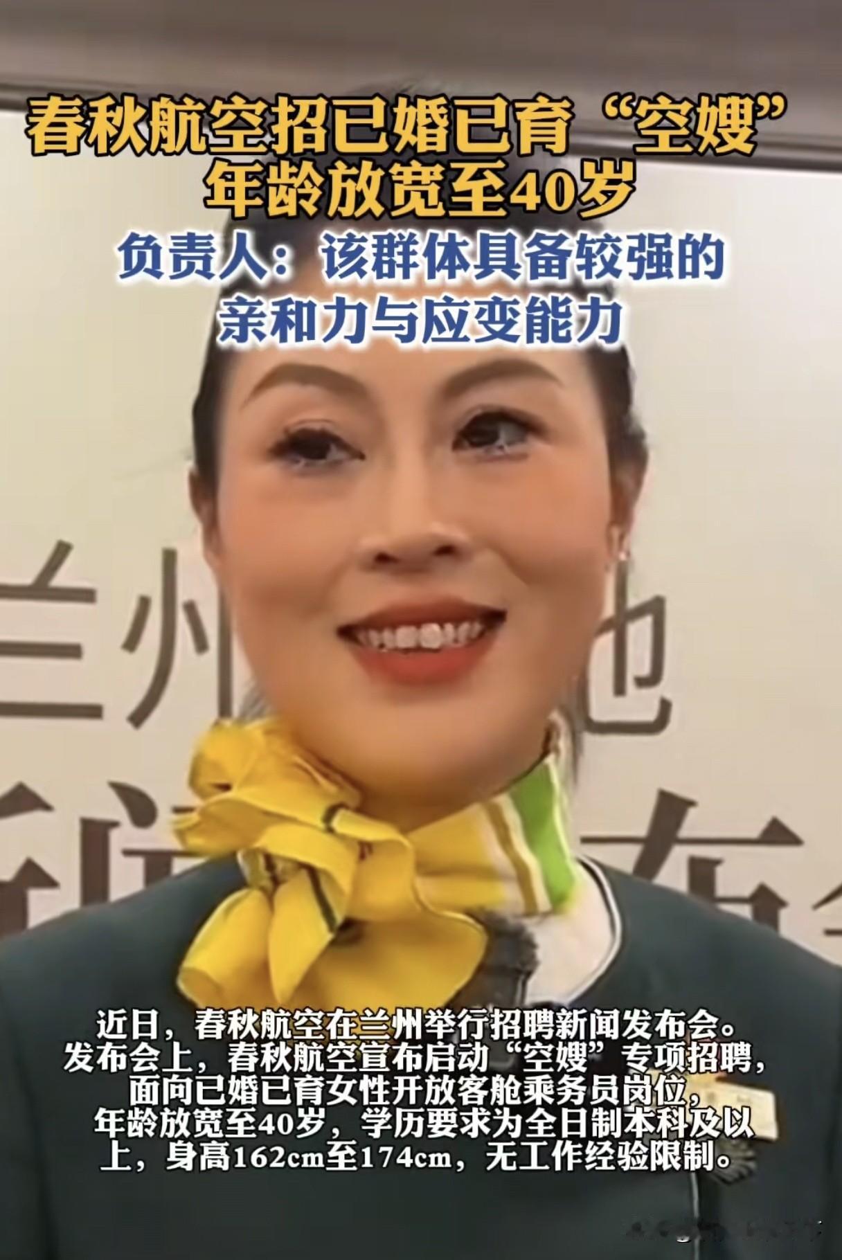 哦豁,18岁空姐变40岁空嫂,大家能接受嘛? 近日,某航空公司的招聘火了一把,直接招已婚已育40岁以内的“空嫂”,让大家对“空姐”有了不一样的认识。 该航空公司招聘负责人表示:该群体的“空嫂”比年轻的“空姐”拥有更大的优势,她们已婚、有家庭、生了小孩,更具亲和力和应变能力。 🈶网友评论:空姐就应该选已婚已育的,35—50是最好的年龄。原因很简单:省得年轻未婚的美女想通过空姐这个职业来影响别人的家庭。这样老公天天坐飞机老婆在家也安心。 也🈶网友评论:说白了不就是为了省点钱,岁数大了活不好找了,得认真工作,而且还便宜,在公司受气了也不会随便离职。 还🈶网友评论: 本来服务行业就应该是当过妈妈的更懂得照顾别人,而不是青春靓丽,那些到底服务个啥,脚踏实挺好。 不知道大家对此事怎么看?欢迎留言一起探讨交流。 空姐 春秋航空空嫂 空少美女