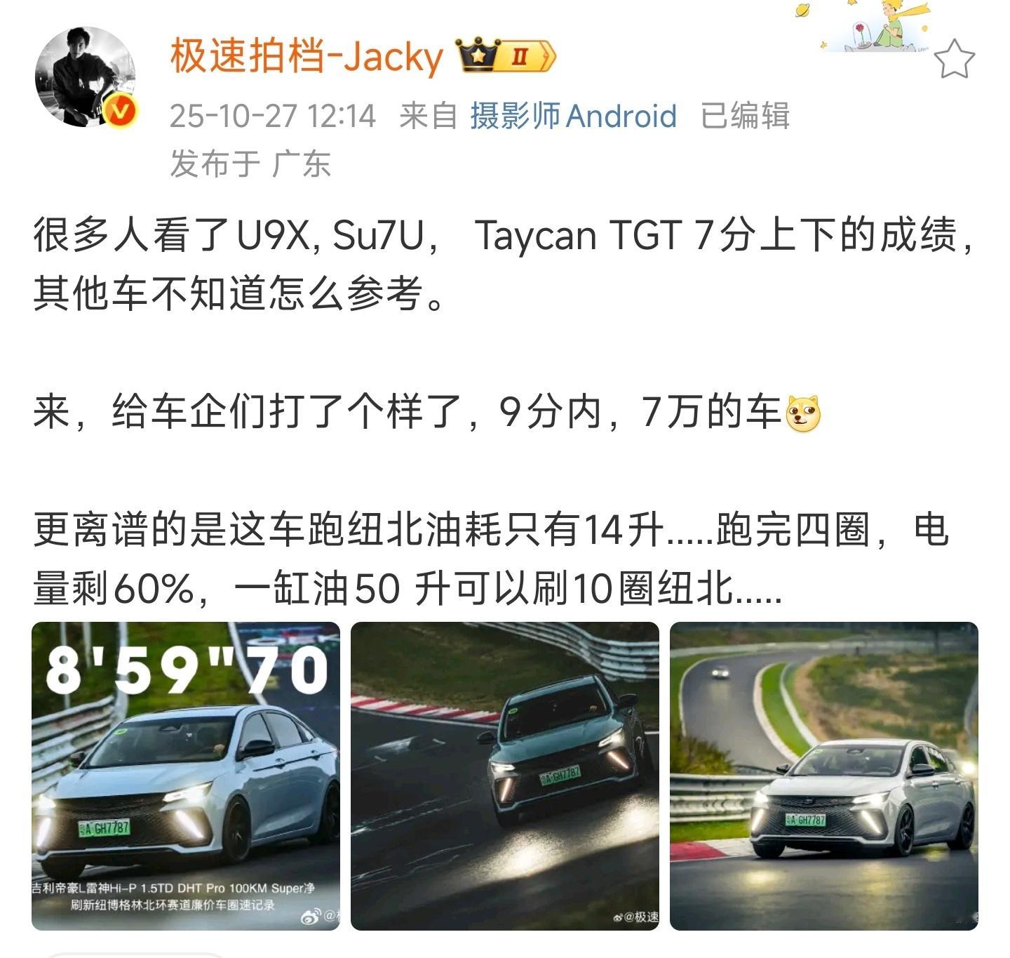 王杰克把他的帝豪拉到德国,在不限速高速跑出253km/h的极速,在纽北跑出9分内的成绩。别忘了这台车原厂只要7万块钱啊……网约车干翻性能车,怪不得吉利要把它停产了[流鼻血][流鼻血]