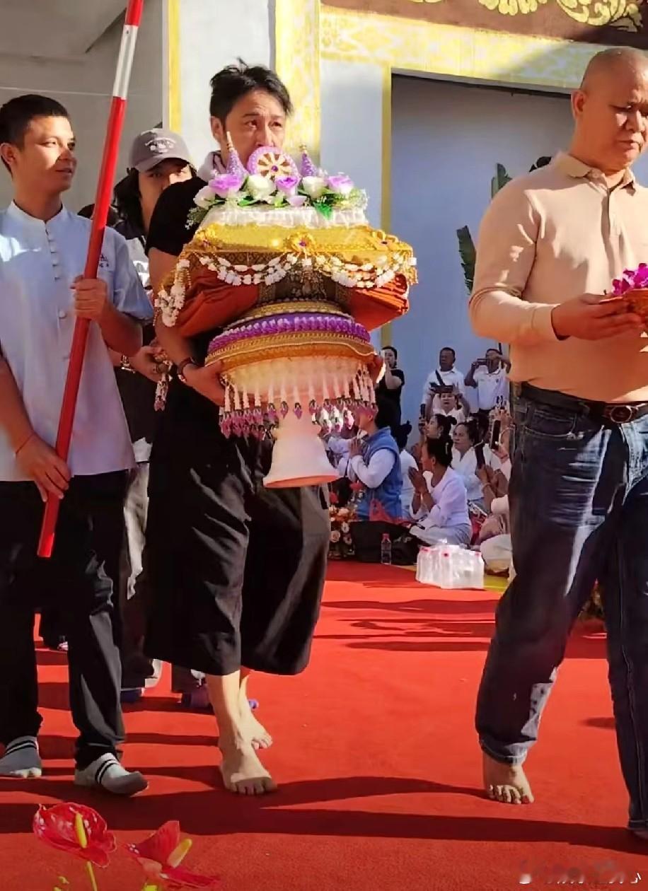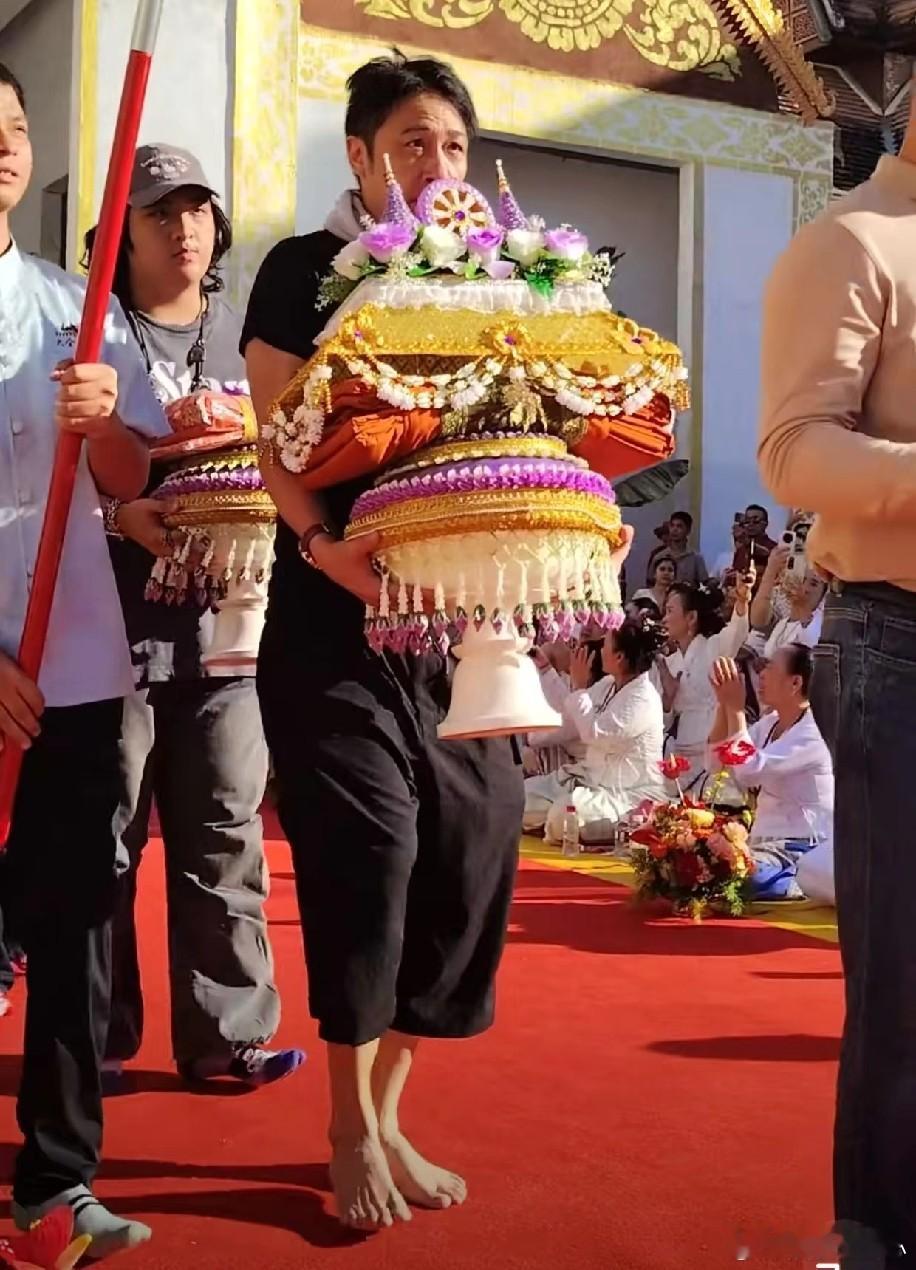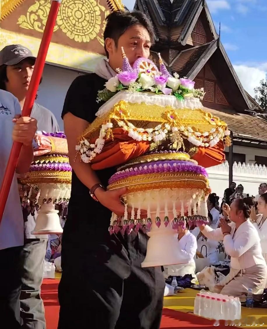 10月27日,吴镇宇带着儿子费曼在西双版纳参加供养仪式,吴镇宇手捧贡品神情严肃又