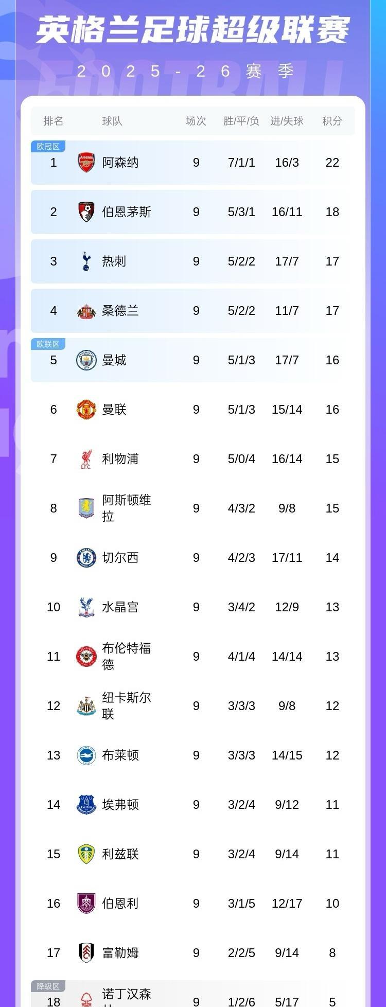今夕是何年 英超第九轮战罢,翻开积分榜一看,阿森纳排名第一没啥说的,第二名伯恩矛斯、第四名升班马桑德兰,传统BIG6只有枪手热刺在前四! 卫冕冠军利物浦一波四连败直接把自己干到第七去了,排在曼联身后,而曼城仅排在第五、切尔西第九,休赛期的钱看来都白花了,还不如卖掉整个后防线的小樱桃! 话说这个第二的伯恩矛斯,赫伊森6300万欧元加盟皇马、4700万欧元将凯尔凯兹卖给利物浦、扎尔巴尼6300万欧元去往大巴黎,杰顿-安东尼加盟伯恩利、瓦塔拉前往小蜜蜂,防线和锋线均有主力离队,就这除了开赛第一场客场2-4不敌利物浦,最近8轮联赛5胜3平保持不败! 其中1-0狼队、1-0热刺、2-1布莱顿、3-1富勒姆、2-0森林,和纽卡、利兹联、水晶宫握手言和,打进16球仅次于热刺、蓝军,和红军、枪手并列属于第二梯队,丢掉11球也处在中游,主教练安多尼-伊劳拉有能啊!