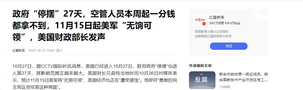 130 万美军断薪了! 当地时间 10 月 27 号,美联邦政府停摆满 27 天,麻烦还在扩大。财长贝森特 26 号放话,11 月 15 号起 130 万美军要 “无薪可领”—— 要知道这可是二战后美军首次面临大规模欠薪,连越南战争、冷战最紧张时都没出过这事儿,经济也在慢慢 “烂掉”,他还喊民主党议员 “别折腾了”,可这话没多少人听。 根子全在两党那点破事儿上。9 月底新财年预算该批了,民主党非要延长医保补贴,还想撤销之前砍的医疗补助,共和党死活不同意,非要先按老样子把政府撑到 11 月 21 号再说,两边都不让步,结果 10 月 1 号起政府直接 “关门” 了。 更缺德的是,共和党还故意冻结民主党主政的芝加哥、纽约的基建资金,拿老百姓的生计施压,哪有一点为国家着想的样子?贝森特喊民主党 “别折腾了”,可共和党也没见让步,说白了就是拿军人的工资当谈判筹码,简直没良心。 别以为美军工资多高,断薪了扛得住。就说 E-5 级的中士,服役 6 年基本工资才 3571 美元,加上住房和食品津贴,一年也就 6 到 7.2 万美元,刚够着美国普通家庭的收入中位数。 可美国人压根没储蓄习惯,54% 的人连 3 个月的应急钱都没有,37% 的人连 400 美元意外开支都扛不住。 这 130 万美军里,65% 都是中低级军官和士兵,近一半要养家,2024 年还有五分之一的现役军人家庭得靠食品券过日子,比全国平均水平高出四个百分点。 现在这些家庭已经快撑不住了。海军技术人员的妻子卡迪・弗雷泽,天天愁得睡不着,已经去慈善机构领免费食物了,她直说 “每两周发一次工资,要是断了,日子就真过不下去了”。 德州胡德堡基地外,凌晨五点就有军人家属排队领教会的救济粮,以前哪见过这阵仗? 军事基地周边的商家更惨,弗吉尼亚州汉普顿罗兹的餐厅老板马里森,店里全靠军人光顾,现在天天对着空店发愁:“没人来吃饭,这生意咋维持?” 经济学家说,就这一个地方,长期停摆可能要损失 10 亿美元,全美加起来更是没法算。 更荒唐的是,政府为了应付 10 月 15 号的发薪日,居然挪用了 80 亿美元的武器研发经费救急。 这笔钱本是给高超音速导弹、下一代隐形战机搞测试的 “救命钱”,现在全变成了工资款。 洛克希德・马丁这些军工巨头急得跳脚,五角大楼内部也直叹气,说这一下要痛失未来五年的技术窗口,原本想缩小和对手的差距,现在直接踩了刹车。 可即便这样,也只是拆东墙补西墙,梅隆银行家族捐了 1.3 亿,摊到 130 万人头上才 100 美元,连一天工资的三分之一都不够,纯属政治作秀。 政府停摆这一个月,美国经济早被折腾得够呛。每周 GDP 就蒸发 150 亿,24 天下来损失超 450 亿,相当于每秒烧掉 52 万美元。要知道 2013 年停摆 16 天就亏了 240 亿,花了半年才恢复;2018 年 35 天亏 110 亿,差点搞垮几个州政府。 现在这架势,再拖到 11 月,专家都说损失要不可逆了。更要命的是军心散了,陆军 “服役满意度指数” 从 72 分跌到 45 分,创 20 年最低,征兵人数只剩去年同期的 45%,连空军和特种作战司令部的司令都辞职了,明眼人都知道是抗议这乱糟糟的局面。 最讽刺的是,特朗普还想着办 “史上最大” 的海军庆典,要调航母战斗群撑场面,钱却要从非紧急项目里挪。一边是士兵家属排队领救济,一边是政府铺张搞庆典,这哪是 “美国力量的宣言”,分明是打自己的脸。 国会山外几百名军属举着 “保障军饷就是保障国家安全” 的标语抗议,可两党还在互相骂街,把军人的生计、国家的经济全抛在脑后。 说穿了,130 万美军断薪不是没钱,而是钱都被党争和浪费糟践了。美国一年军费 8860 亿,比中、俄等十五国总和还多,可真正给军人发薪的钱才占 20.6%,剩下的要么砸在重复采购上,要么被海外基地耗掉。 现在闹出这么大动静,说白了就是政客们只顾着自己的权力,根本不管老百姓和军人的死活。这哪是超级大国该有的样子,分明是内里烂透了的空架子,再这么折腾下去,迟早要出大问题。