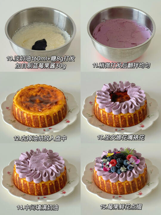 奶油部分:蓝莓酱30g(蓝莓100g+糖10g+半个柠檬汁)+淡奶油160ml+白糖8g打发