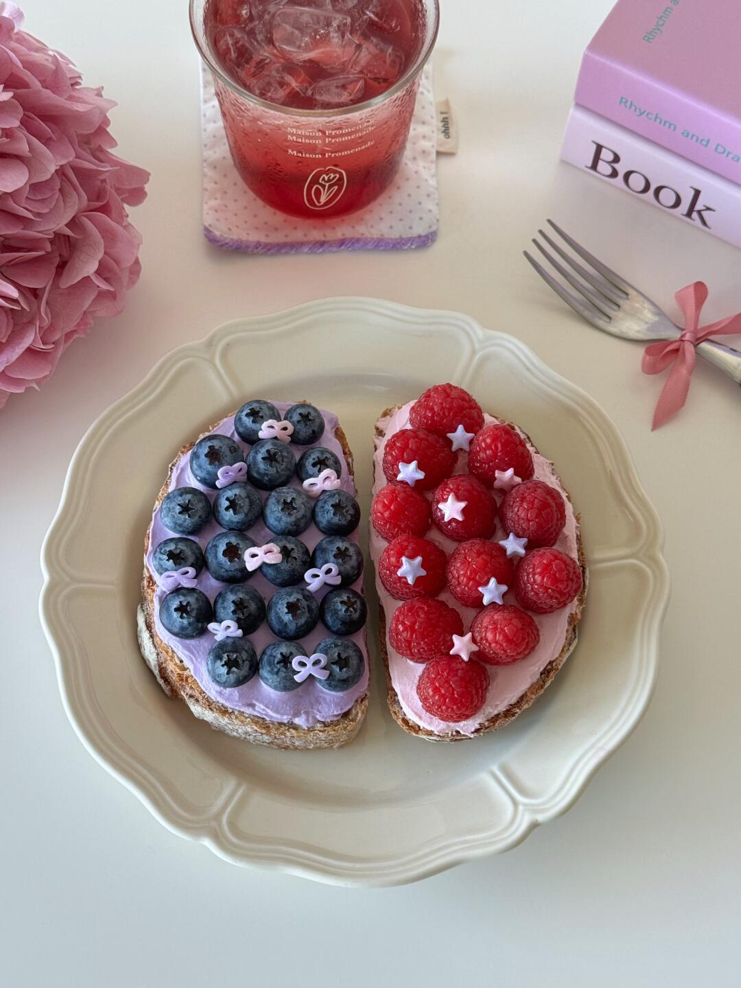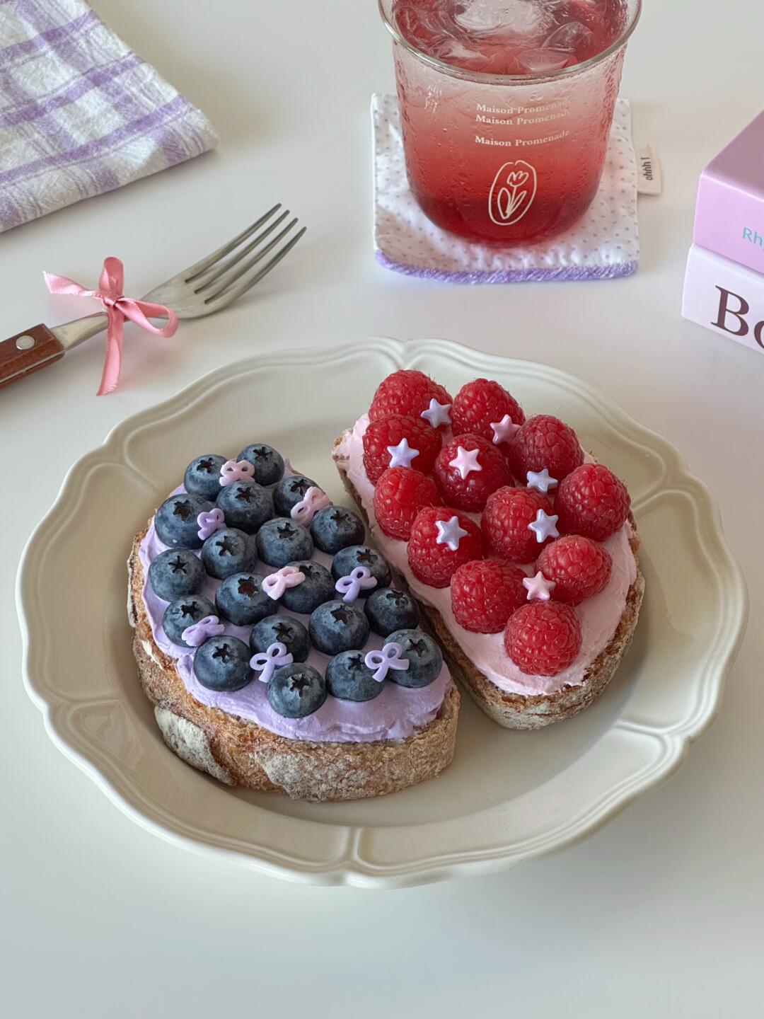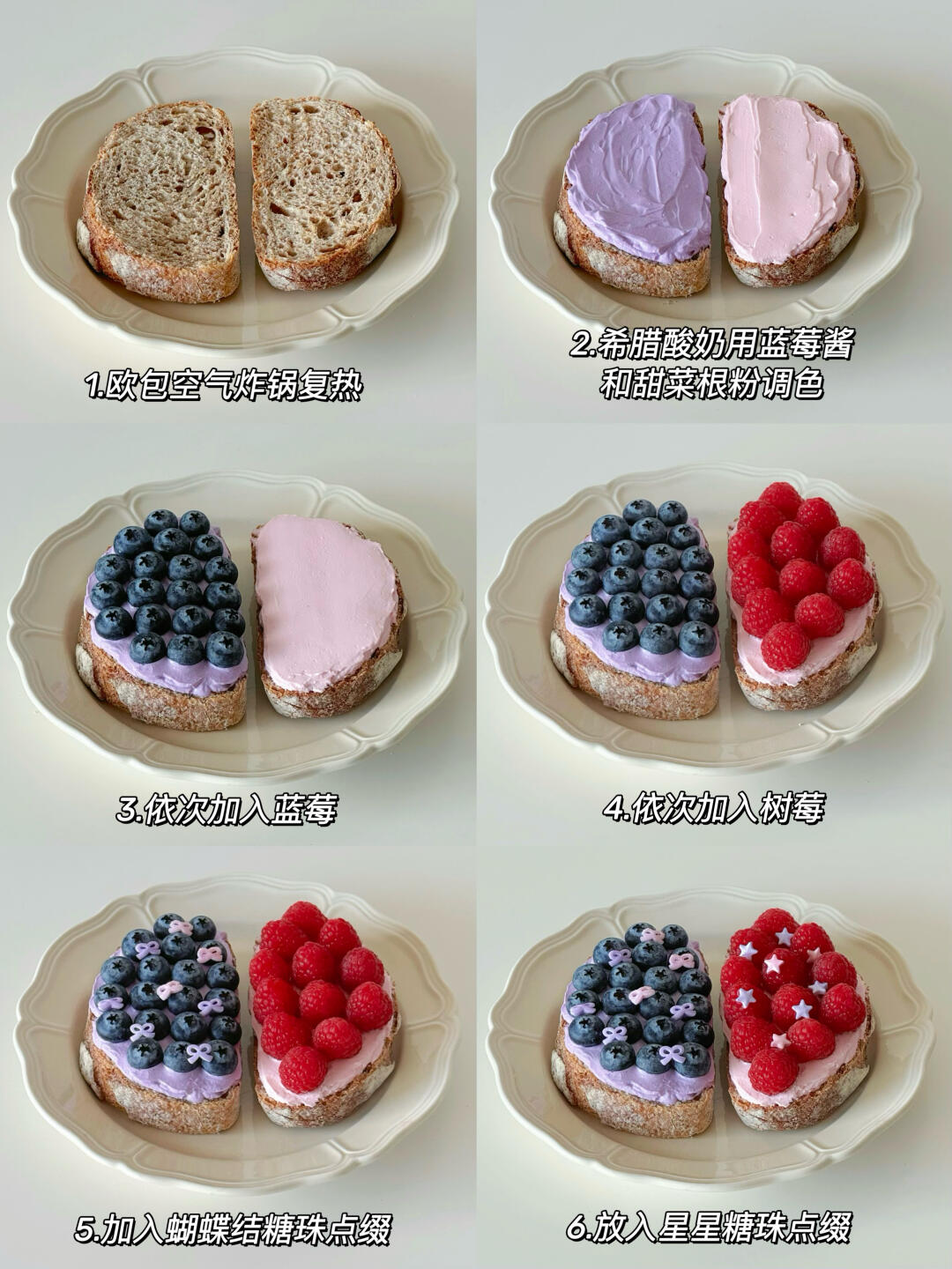 Hi👋朋友们~ 今天是少女心满满的莓果欧包双拼组合~ 搭配一杯葡萄醋打底做的气泡水🍇一口下去敲清爽🫧回味有淡淡的葡萄香!佐餐的宝藏解腻搭子~感兴趣的宝子一起做起来吧! · 🫐开放欧包材料: 全麦欧包、蓝莓、树莓、糖珠点缀 希腊酸奶(蓝莓酱、甜菜根粉调色) 🍇葡萄醋气泡水材料: 葡萄醋、冰块、茉莉青柠气泡水 ·