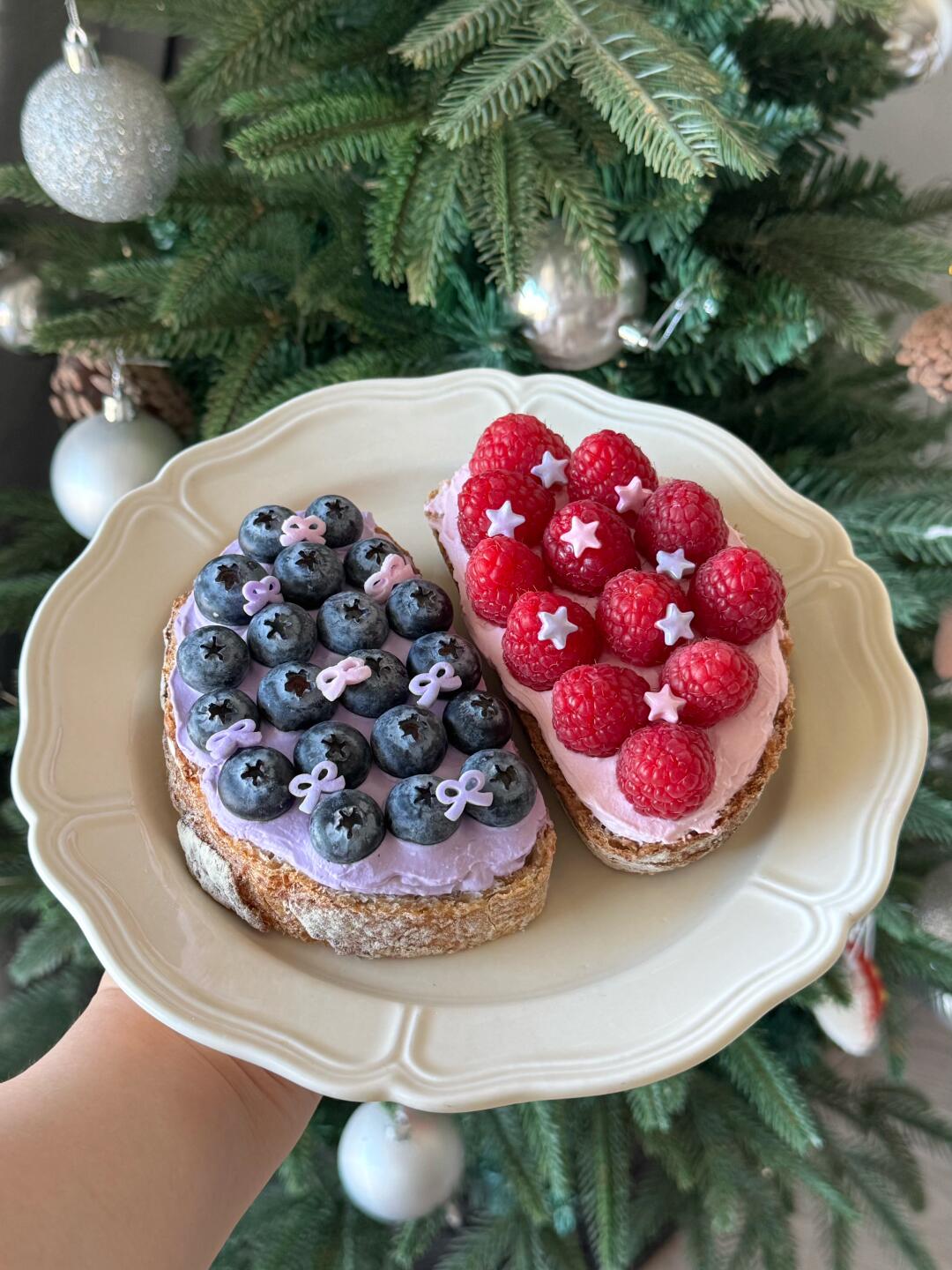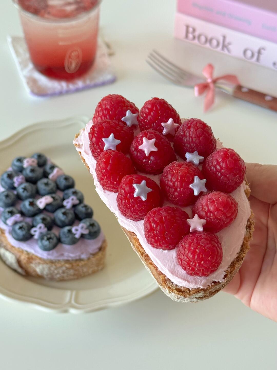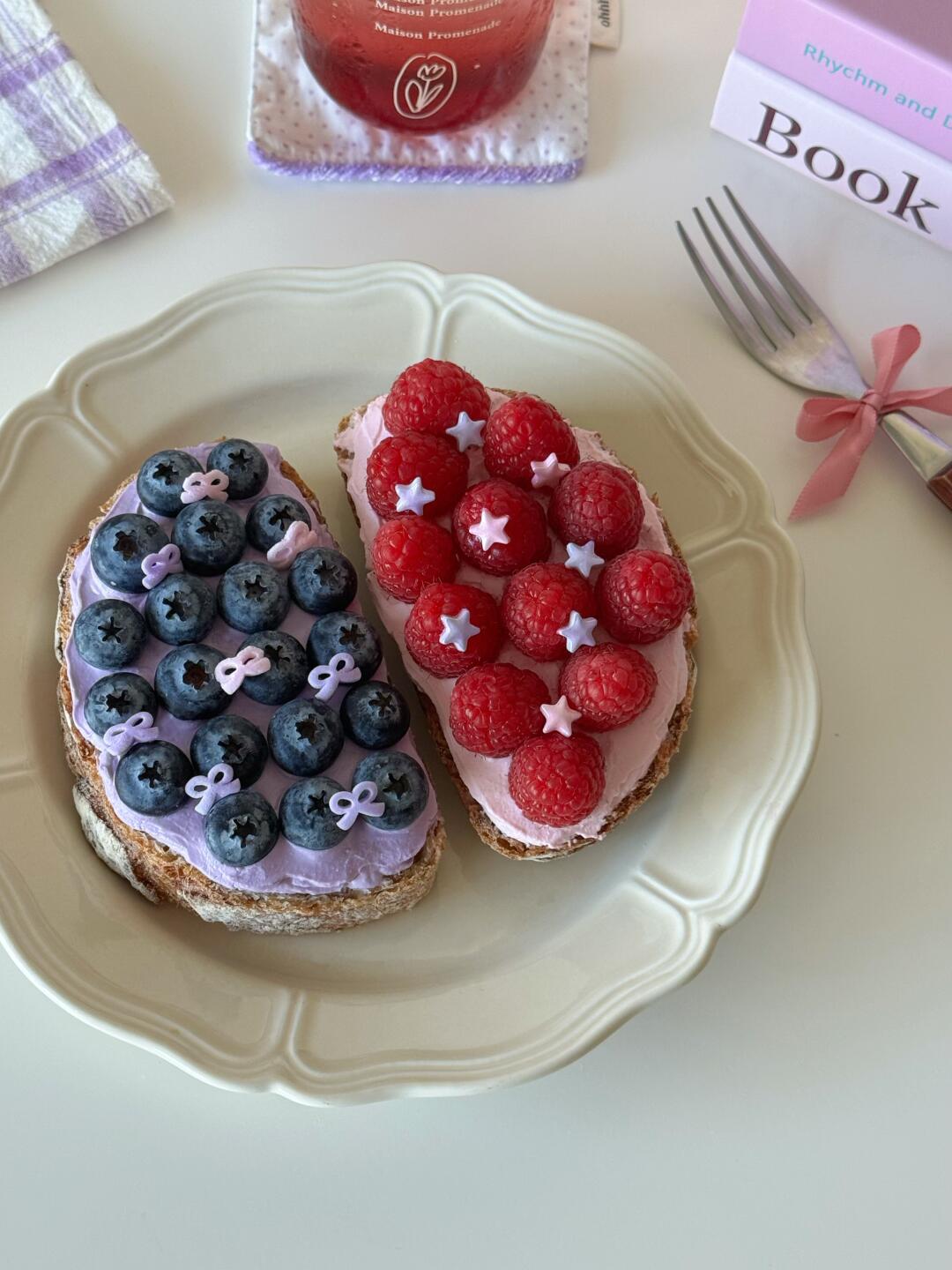 Hi👋朋友们~ 今天是少女心满满的莓果欧包双拼组合~ 搭配一杯葡萄醋打底做的气泡水🍇一口下去敲清爽🫧回味有淡淡的葡萄香!佐餐的宝藏解腻搭子~感兴趣的宝子一起做起来吧! · 🫐开放欧包材料: 全麦欧包、蓝莓、树莓、糖珠点缀 希腊酸奶(蓝莓酱、甜菜根粉调色) 🍇葡萄醋气泡水材料: 葡萄醋、冰块、茉莉青柠气泡水 ·