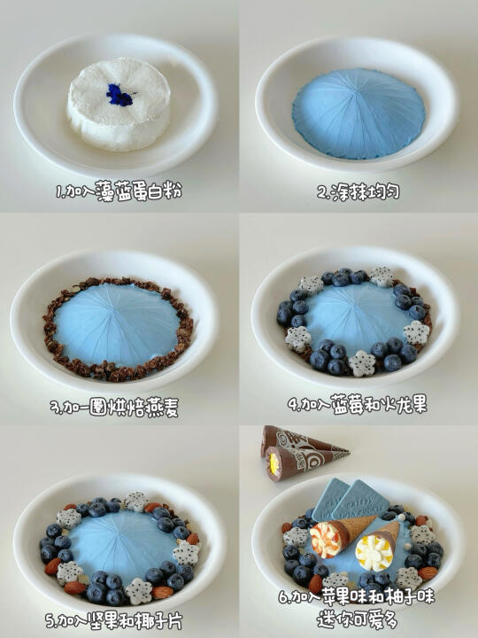 1️⃣酸奶提前过滤一夜,浓稠酸奶加入藻蓝蛋白粉调出想要的蓝色。