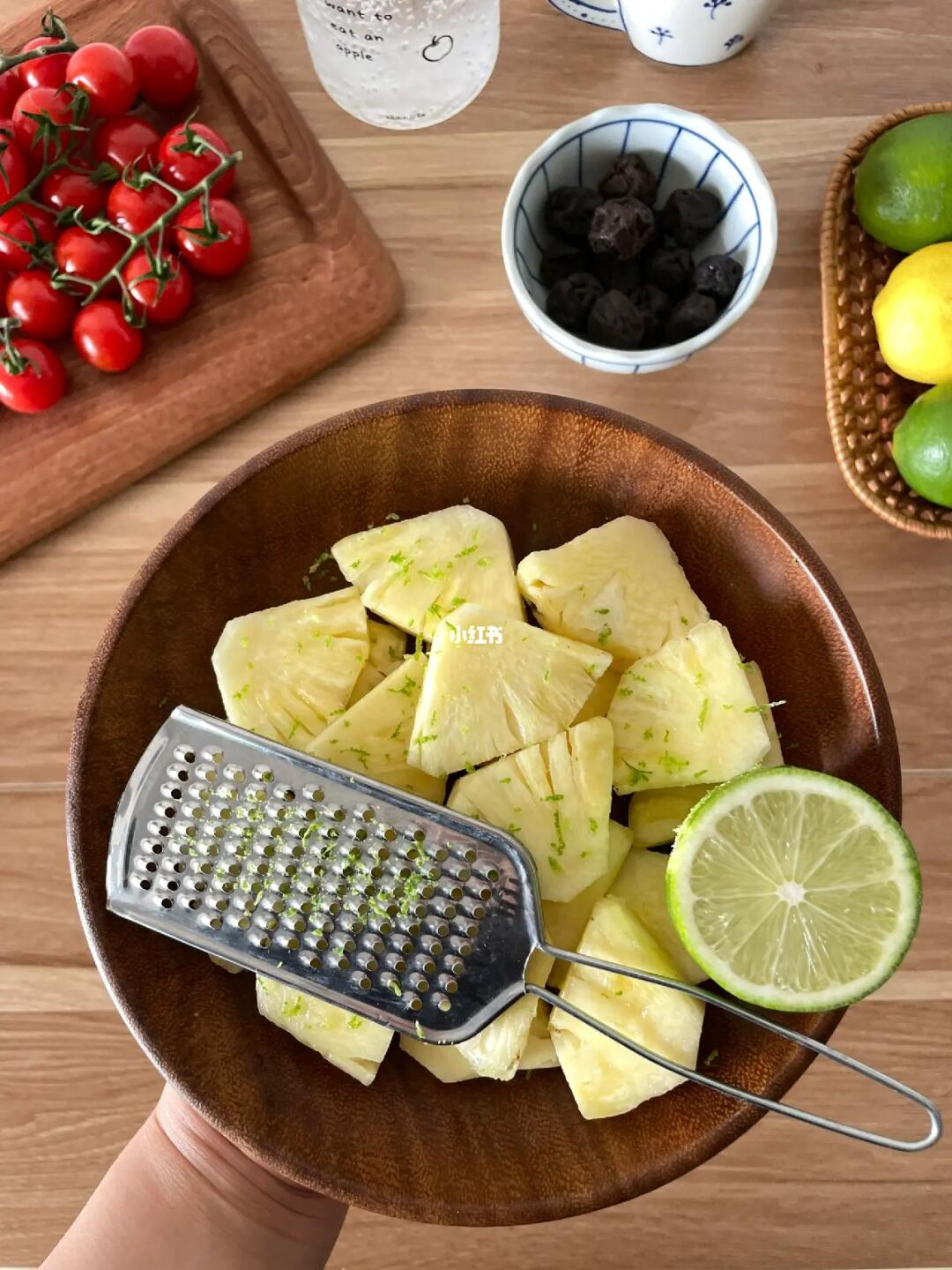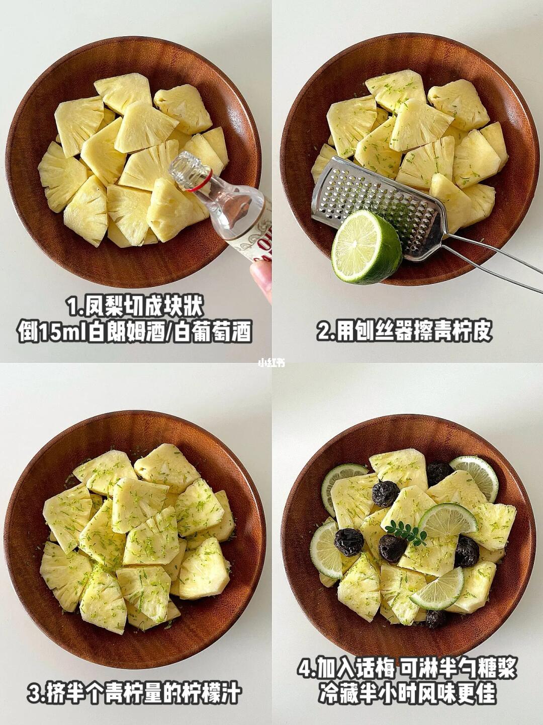 1️⃣凤梨切块后切薄片,淋上白朗姆酒后,用刨丝器擦青柠皮,挤半个柠檬的汁后拌匀。