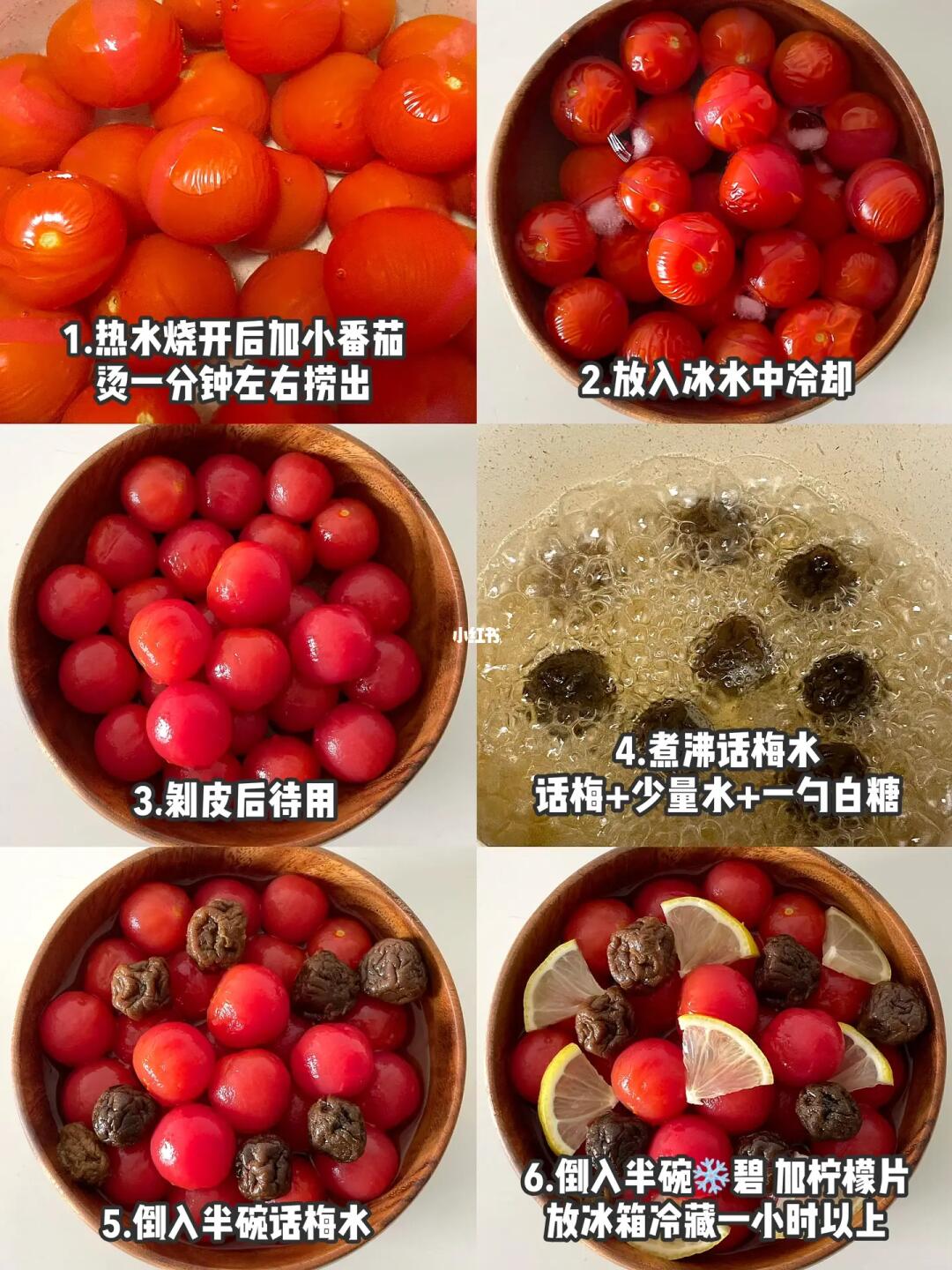 1️⃣热水烧开后加入小番茄,烫一分钟左右捞出,放入冰水中,这样方便剥皮。