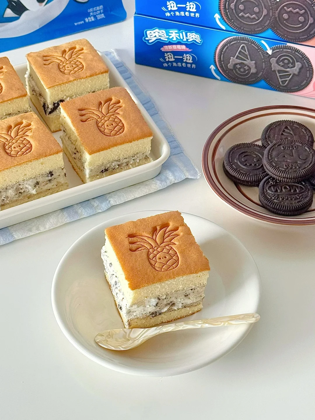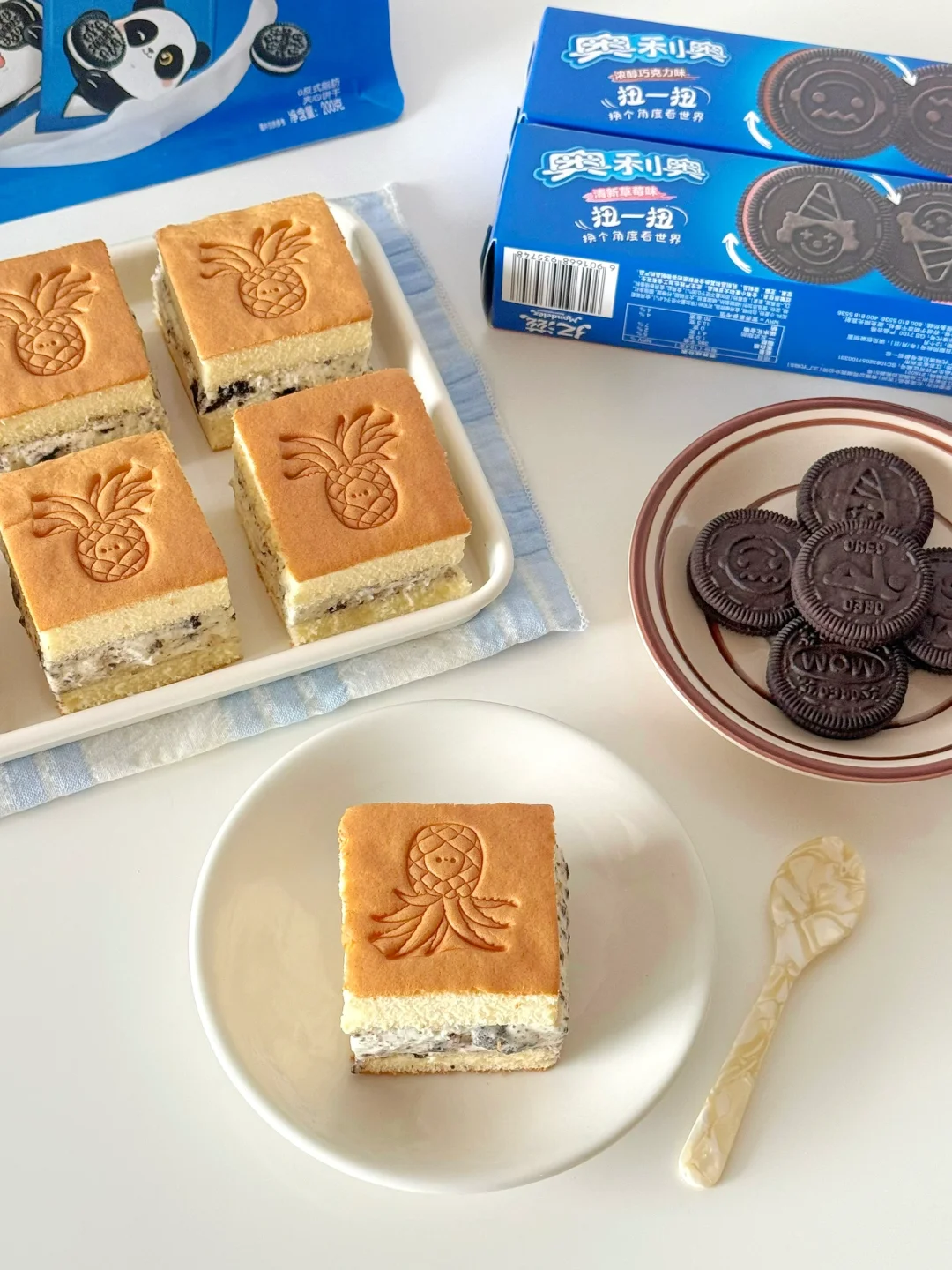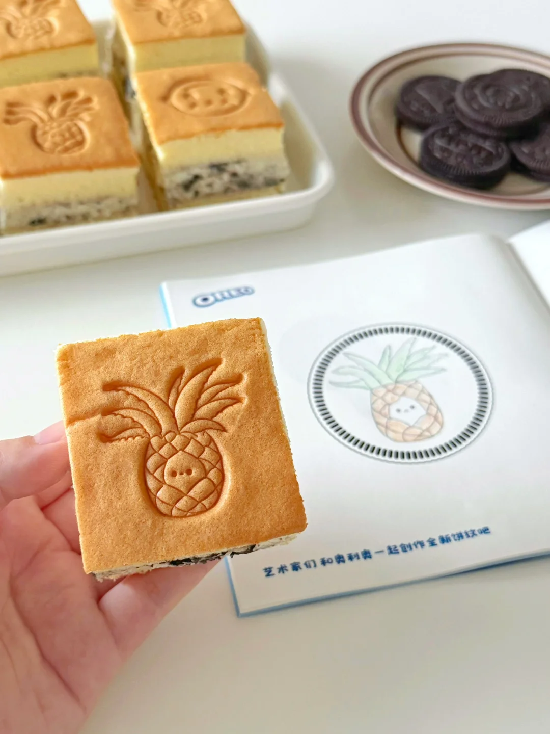 3️⃣出炉后放凉,一片蛋糕片中间加奥利奥奶油(奶油400ml+白糖25g+奥利奥碎50g)再覆盖一片蛋糕片,切割成小正方形,表面烙印翻转图案。