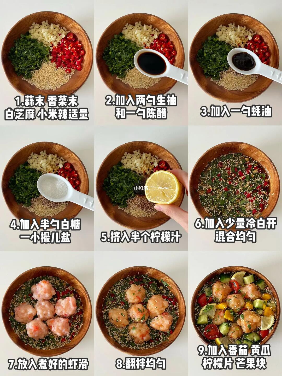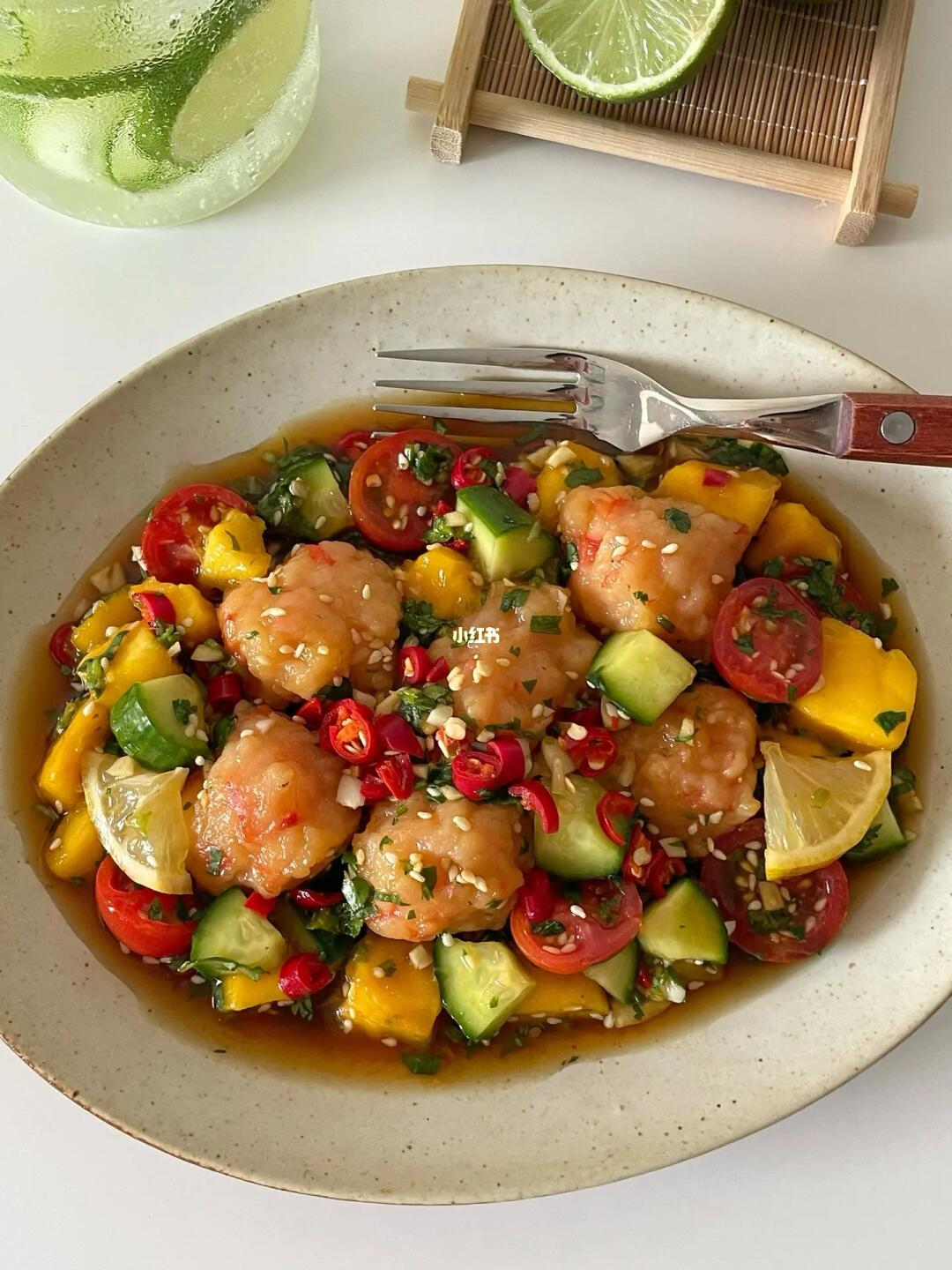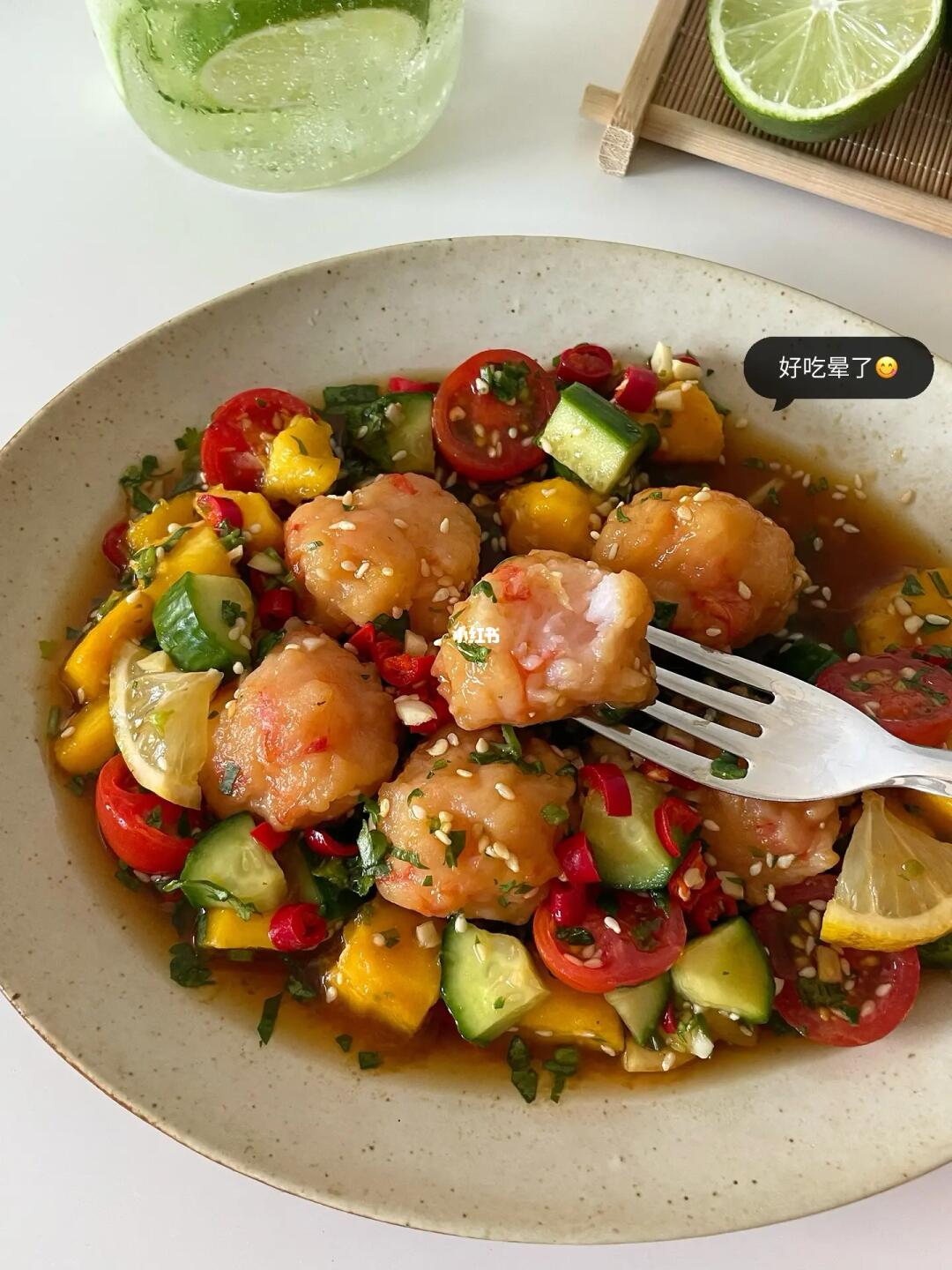 Hi👋朋友们👧🏻👦🏻~ 酸酸辣辣的泰式虾滑🍤是近期超爱的一道开胃菜🥒而且还可以当作低卡餐✌️一起做起来吧 · 📝准备材料: 黑虎虾仁虾滑、黄瓜、芒果、番茄 香菜、柠檬、白芝麻、蒜末、小米辣 🍅具体步骤: 1️⃣调料汁:碗中加蒜末、小米辣、白芝麻和香菜末,再加两勺生抽、一勺陈醋和一勺蚝油,加半勺白糖/代糖和一小撮儿盐,挤半个柠檬汁,倒入小半碗冷白开混匀。 2️⃣虾滑用勺子🥄舀成丸子状,放入热水中煮熟捞出,放入料汁中。 3️⃣再加入芒果、黄瓜、番茄和少许柠檬片翻拌均匀,腌制久一些更入味。 ·