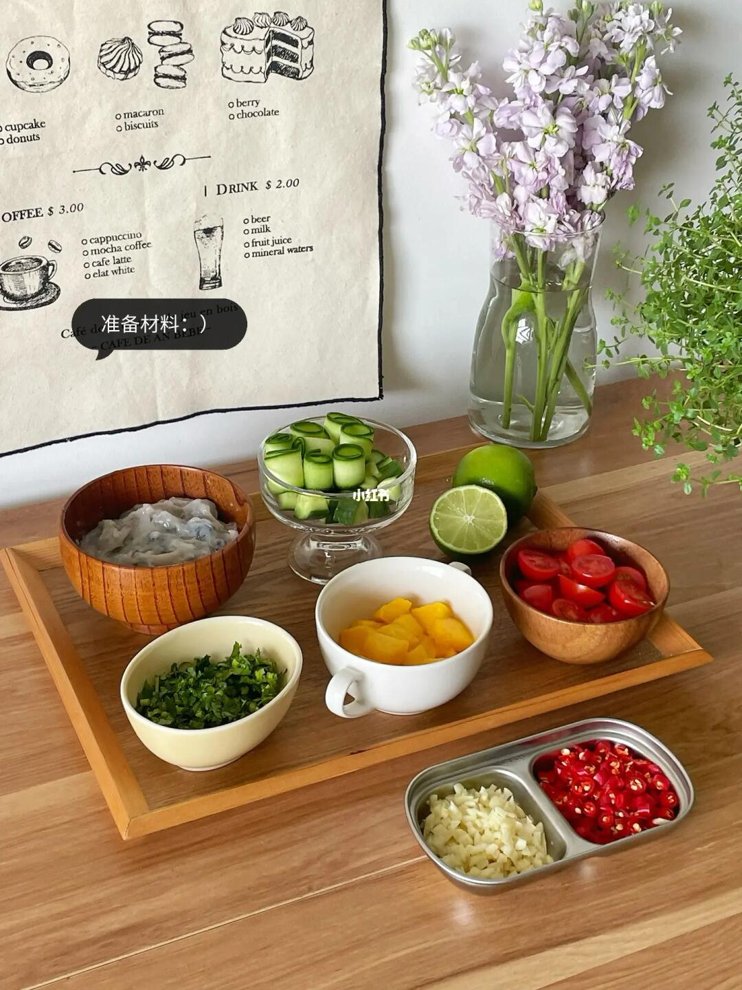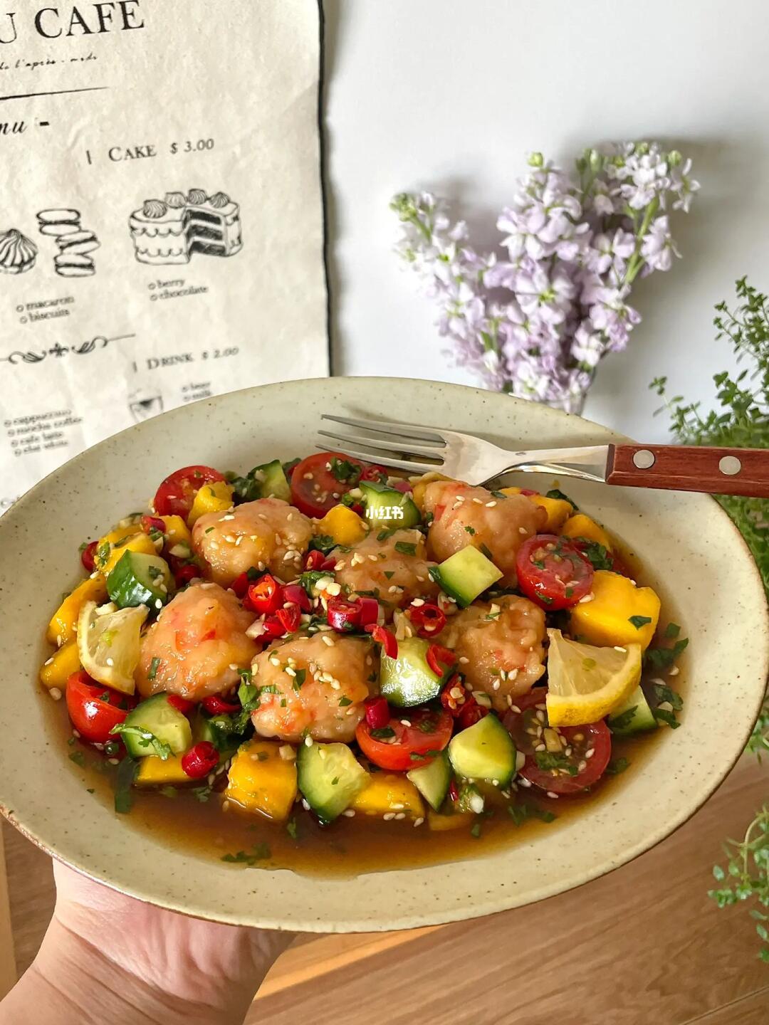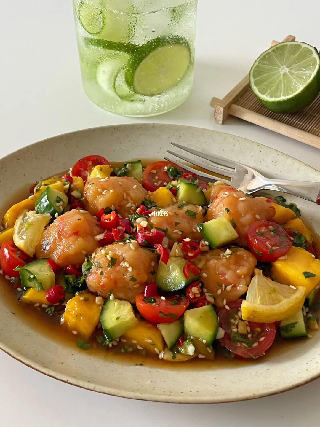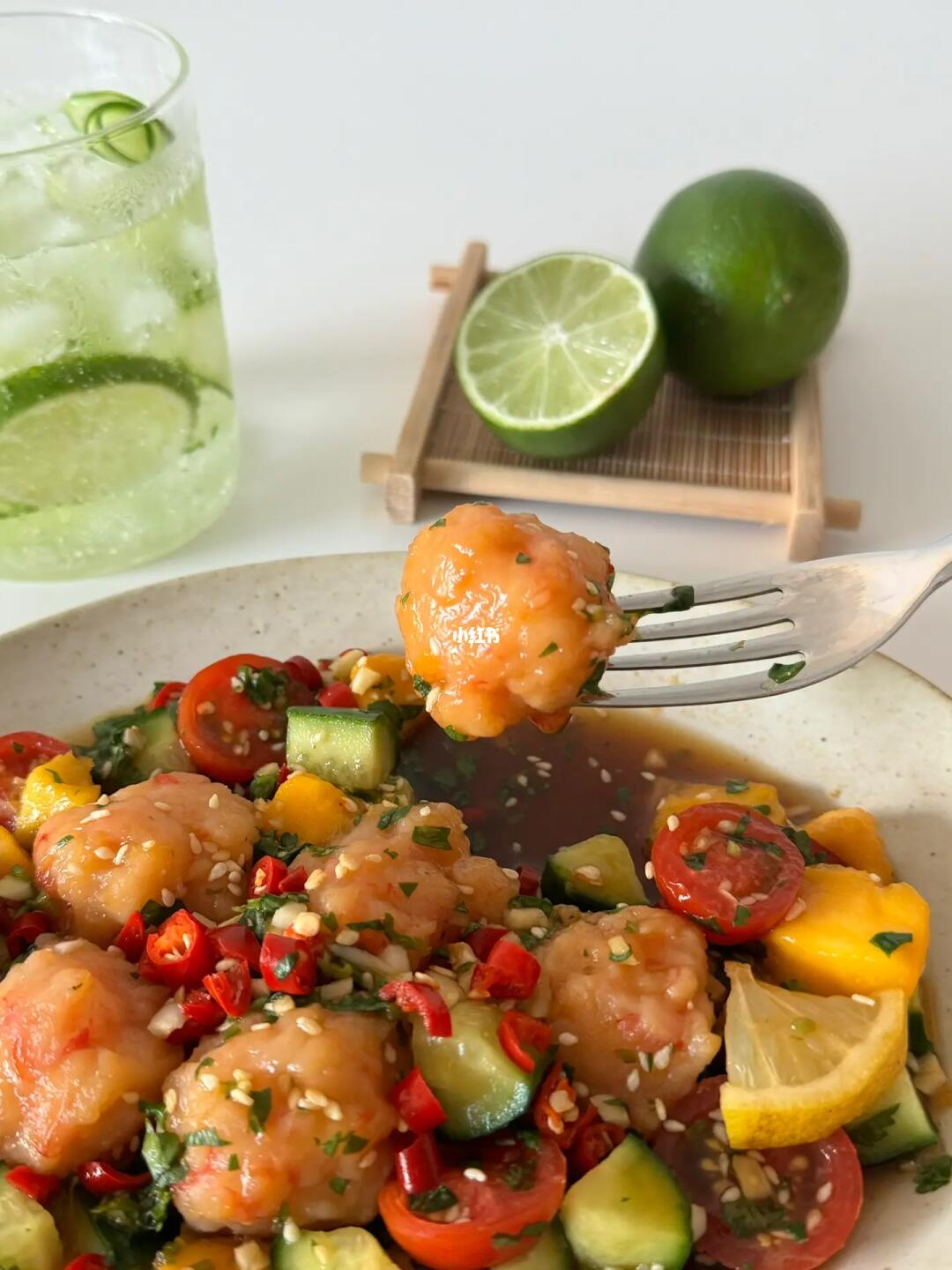 Hi👋朋友们👧🏻👦🏻~ 酸酸辣辣的泰式虾滑🍤是近期超爱的一道开胃菜🥒而且还可以当作低卡餐✌️一起做起来吧 · 📝准备材料: 黑虎虾仁虾滑、黄瓜、芒果、番茄 香菜、柠檬、白芝麻、蒜末、小米辣 🍅具体步骤: 1️⃣调料汁:碗中加蒜末、小米辣、白芝麻和香菜末,再加两勺生抽、一勺陈醋和一勺蚝油,加半勺白糖/代糖和一小撮儿盐,挤半个柠檬汁,倒入小半碗冷白开混匀。 2️⃣虾滑用勺子🥄舀成丸子状,放入热水中煮熟捞出,放入料汁中。 3️⃣再加入芒果、黄瓜、番茄和少许柠檬片翻拌均匀,腌制久一些更入味。 ·