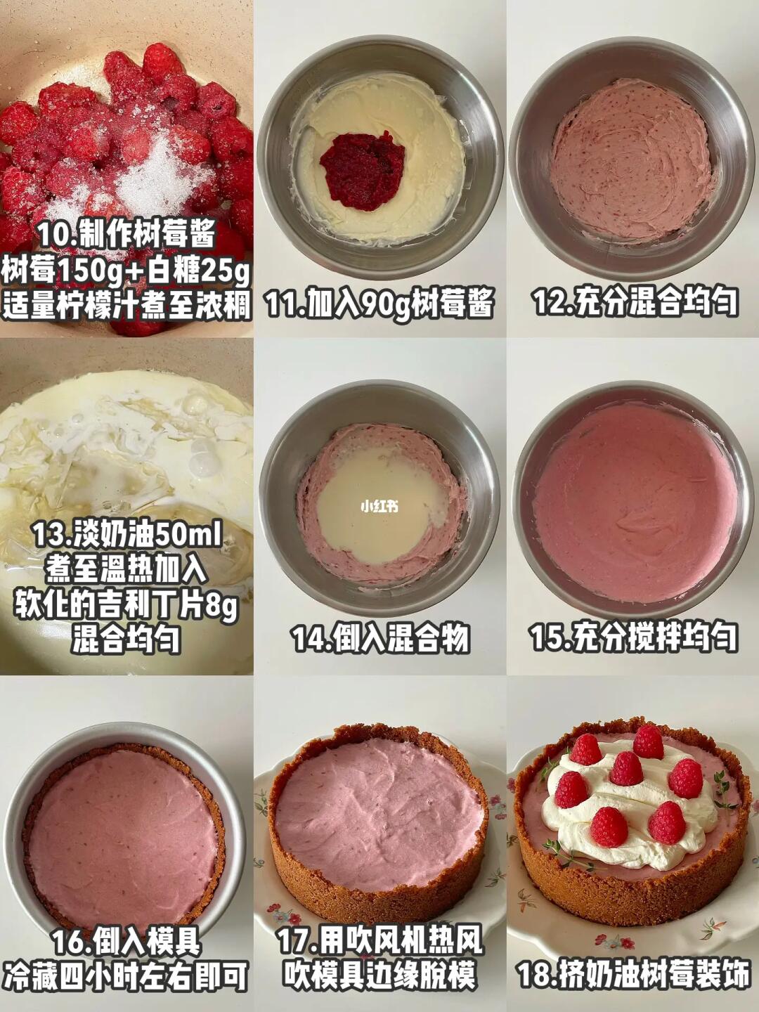 2️⃣奶油奶酪软化后加白糖混匀,再加树莓酱、淡奶油依次混匀,另外50ml淡奶油小火煮至温热,加提前冷水泡软的吉利丁片混匀,再倒入奶酪糊中,混匀后倒入模具冷藏4小时。