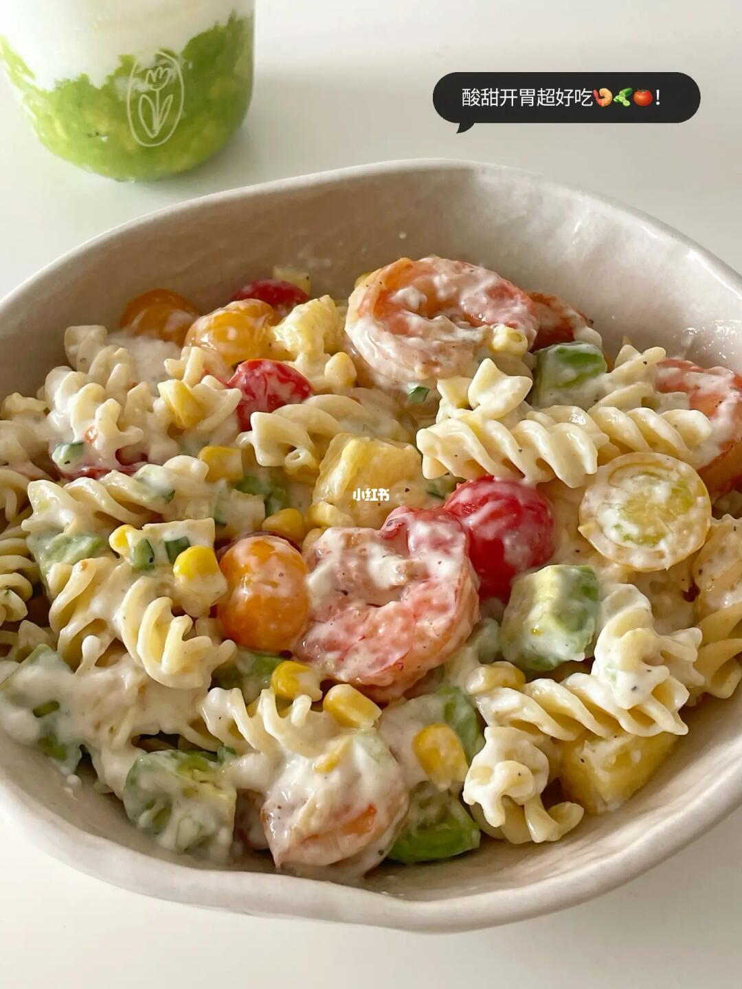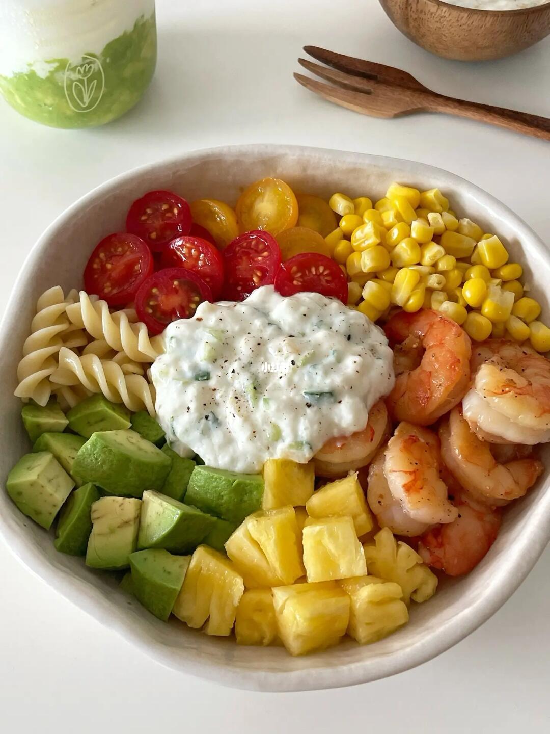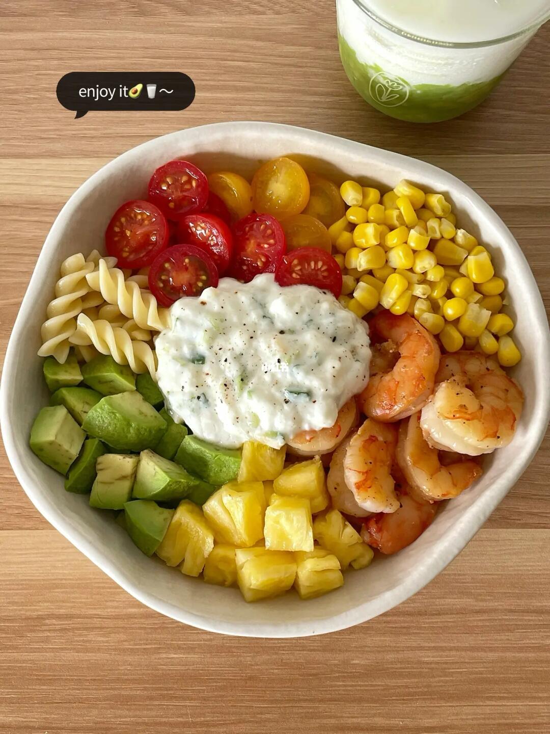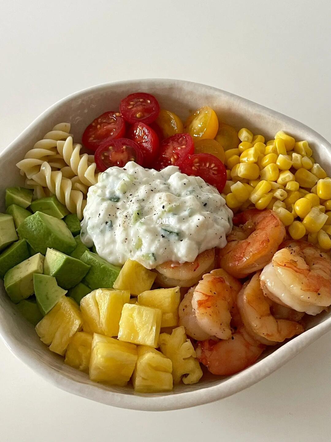 今天一起来做好吃的酸奶酱意面沙拉~搭配上春天的菠萝和喜欢的虾仁蔬果🍤是低卡又美味的一顿呢🥒一起做起来吧☁️