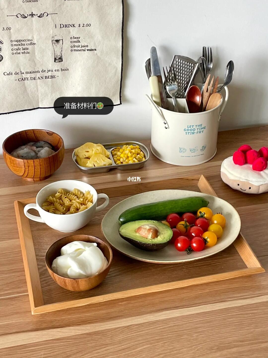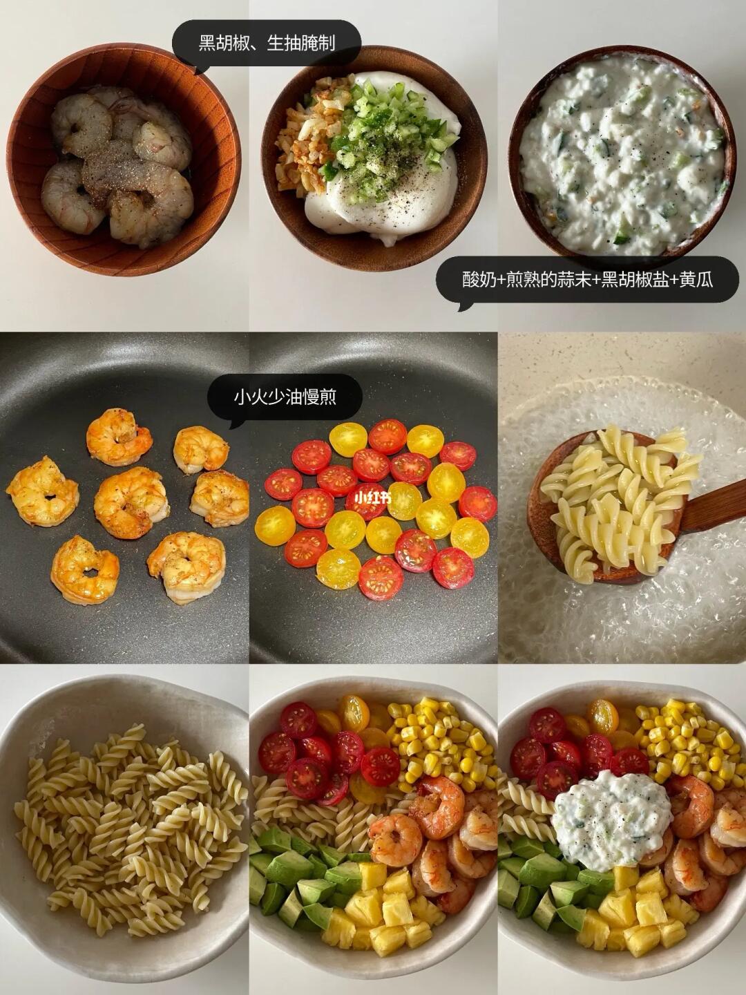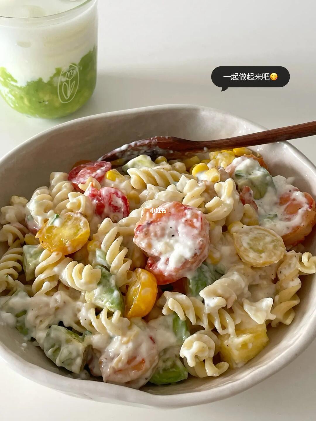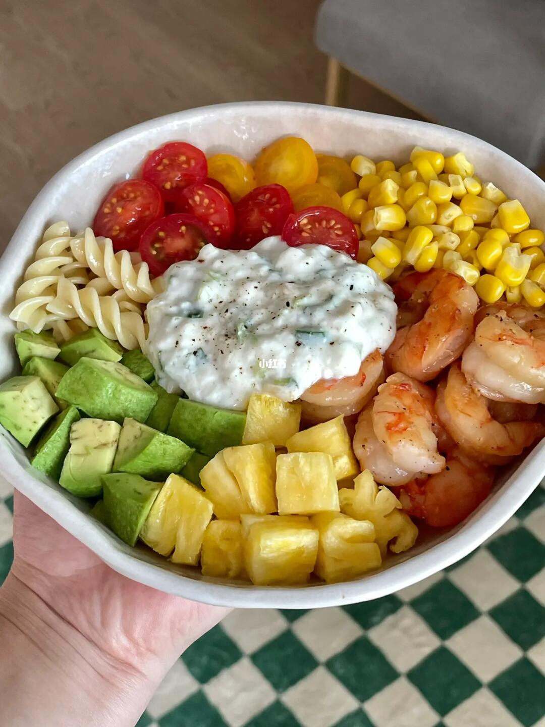 今天一起来做好吃的酸奶酱意面沙拉~搭配上春天的菠萝和喜欢的虾仁蔬果🍤是低卡又美味的一顿呢🥒一起做起来吧☁️