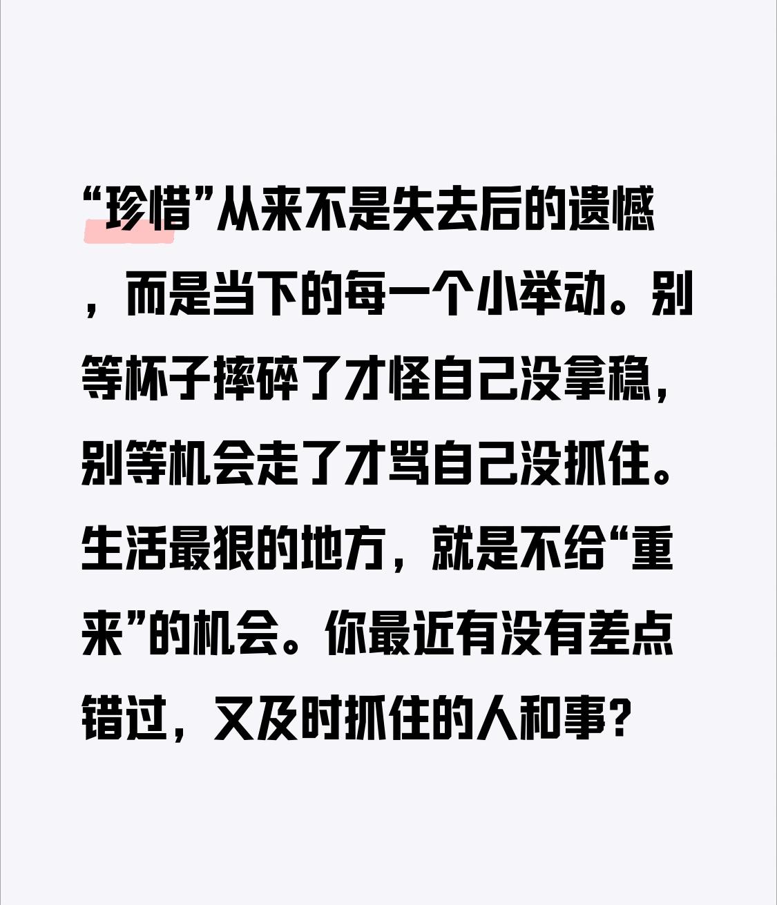 到失去后,才懂珍惜,就已来不及——这句话扎心吗?可我们总在犯同一个错:把“以后”当万能借口,把身边的人和事当永远不会消失的背景板。 你是不是也这样?妈妈打电话时嫌她唠叨,挂了才想起好久没说“我想你”;朋友约吃饭总说“下次”,直到对方搬家才发现没好好聚过;就连手里的健康,也总在熬夜、瞎吃时不当回事,等身体亮红灯才慌神。永远懂得珍惜 “珍惜”从来不是失去后的遗憾,而是当下的每一个小举动。别等杯子摔碎了才怪自己没拿稳,别等机会走了才骂自己没抓住。生活最狠的地方,就是不给“重来”的机会。你最近有没有差点错过,又及时抓住的人和事?