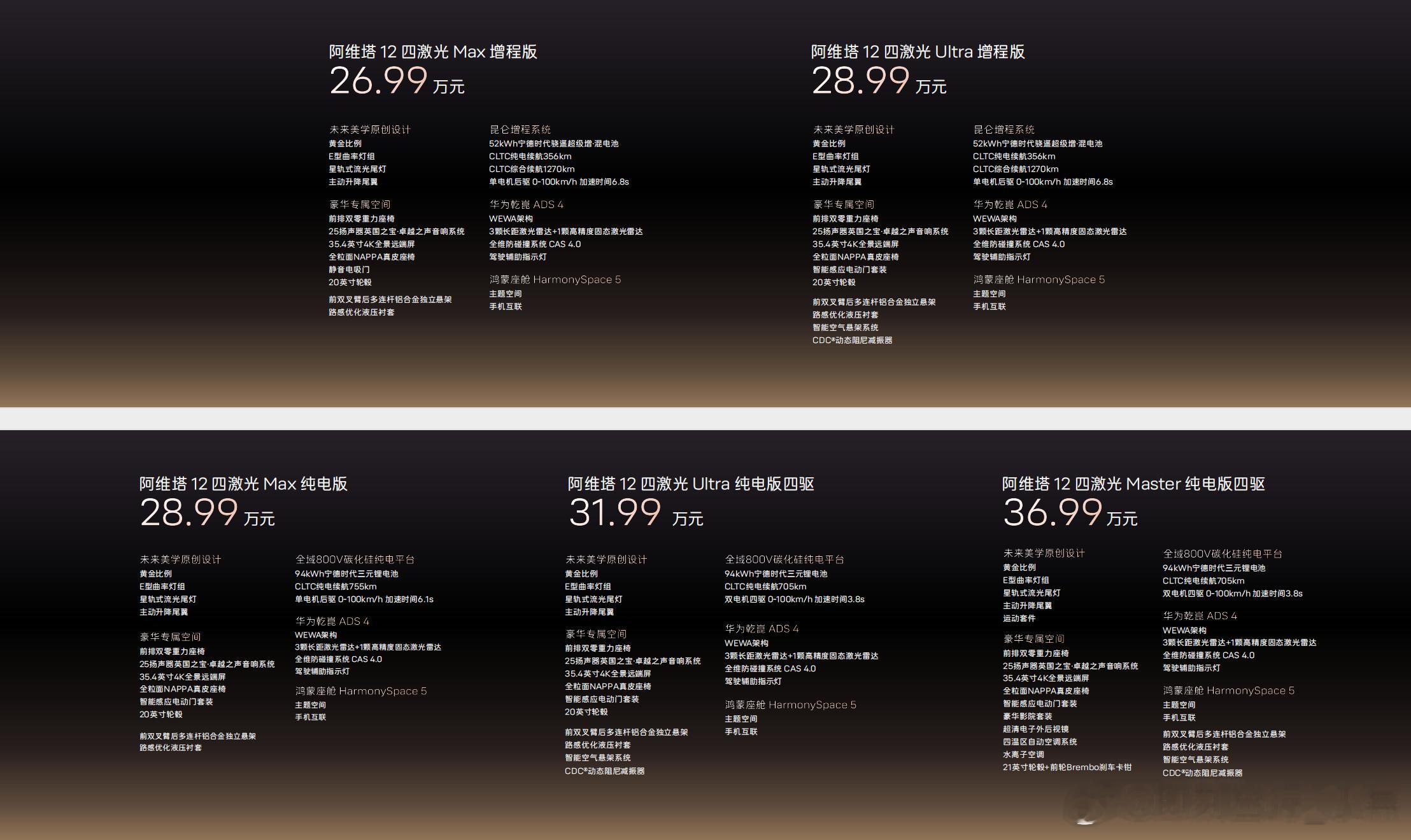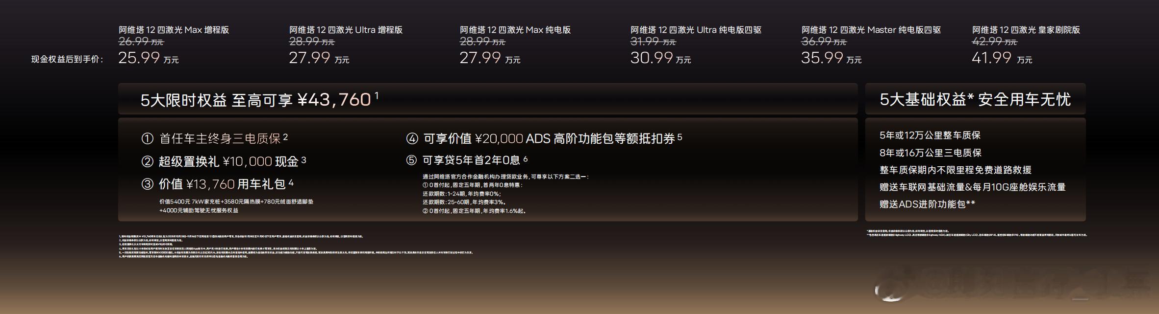 "焕新后的阿维塔12外形独特,在华为智能化技术加持下产品力进一步提升。"余承东在连线中强调。他同时承诺,华为将持续投入创新、打磨核心技术,为用户带来更舒适安心的出行体验,更对品牌未来发展寄予厚望。从技术赋能到生态共融,阿维塔12四激光版的上市,正是双方六年合作成果的集中展现,也为高端智能汽车市场树立了新的价值标杆。官方指导价为26.99万元-42.99万元,权益后到手价为25.99万元-41.99万元阿维塔12四激光版上市
