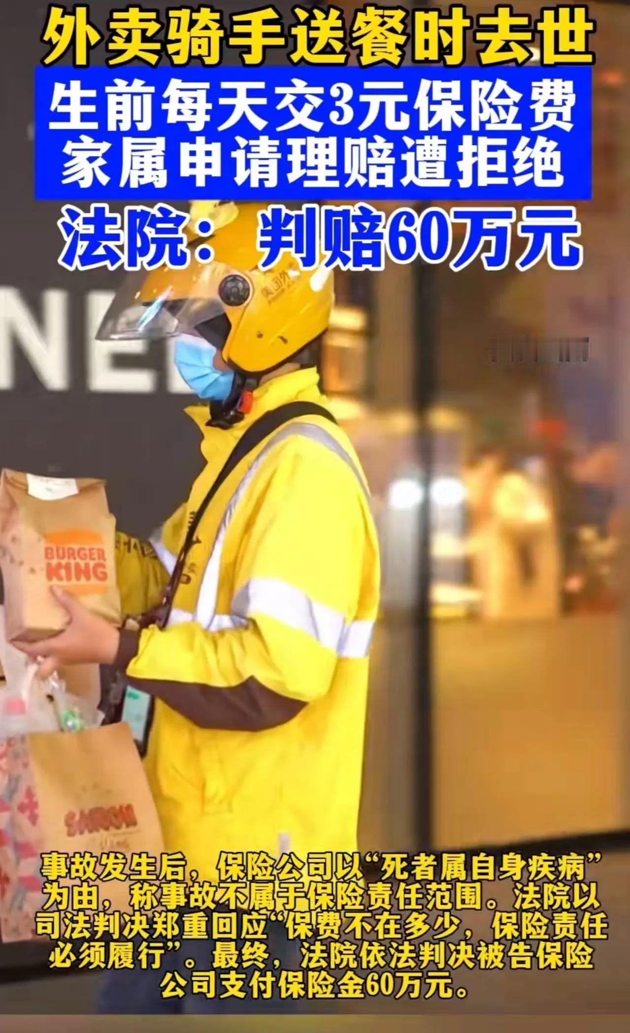 “这次保险公司输了!”郑州,外卖骑手送餐时去世,每天交3元保险费,却遭保险公司拒赔!而法院的判决,大快人心!法院:赔60万 这起事件令人痛心,也引发了关于保险权益的关注。据报道,郑州的一名外卖骑手在送餐途中不幸去世,虽然他每天只缴纳3元的保险费,但保险公司却拒绝理赔。法院经过审理后,判决保险公司应支付60万元赔偿金,以维护骑手的权益。 此案提醒我们,购买保险不仅是保障自己权益的重要方式,也需要保险公司履行应尽的责任。希望相关部门加强监管,确保保险合同的公平执行,保障劳动者的合法权益。送外卖事故 外卖事故 车祸保险拒赔 美团外卖欺诈